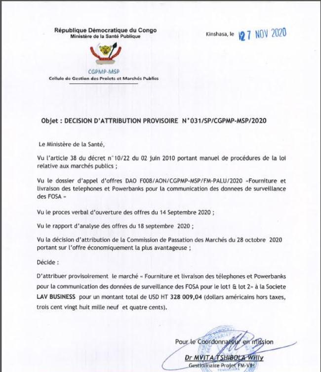 Attribution définitive du marché relatif à la fourniture et livraison des téléphones et power Banks pour la communication des données de surveillance des fosa pour le lot 1 & lot 2