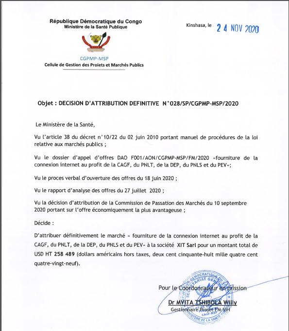 Attribution définitive du marché de fourniture de la connexion internet au profit de la cagf, du pnlt, de la dep, du pnls et du pev