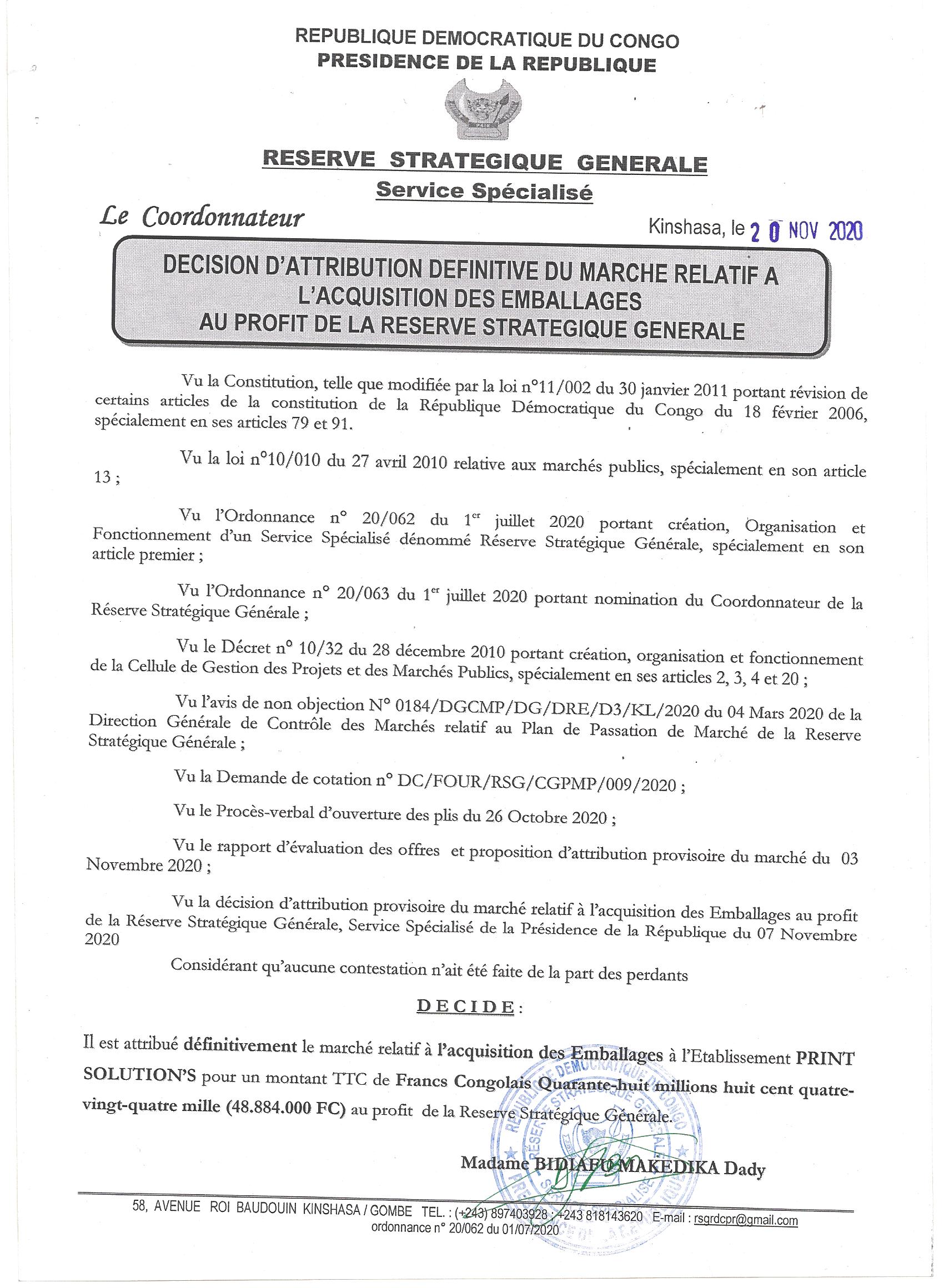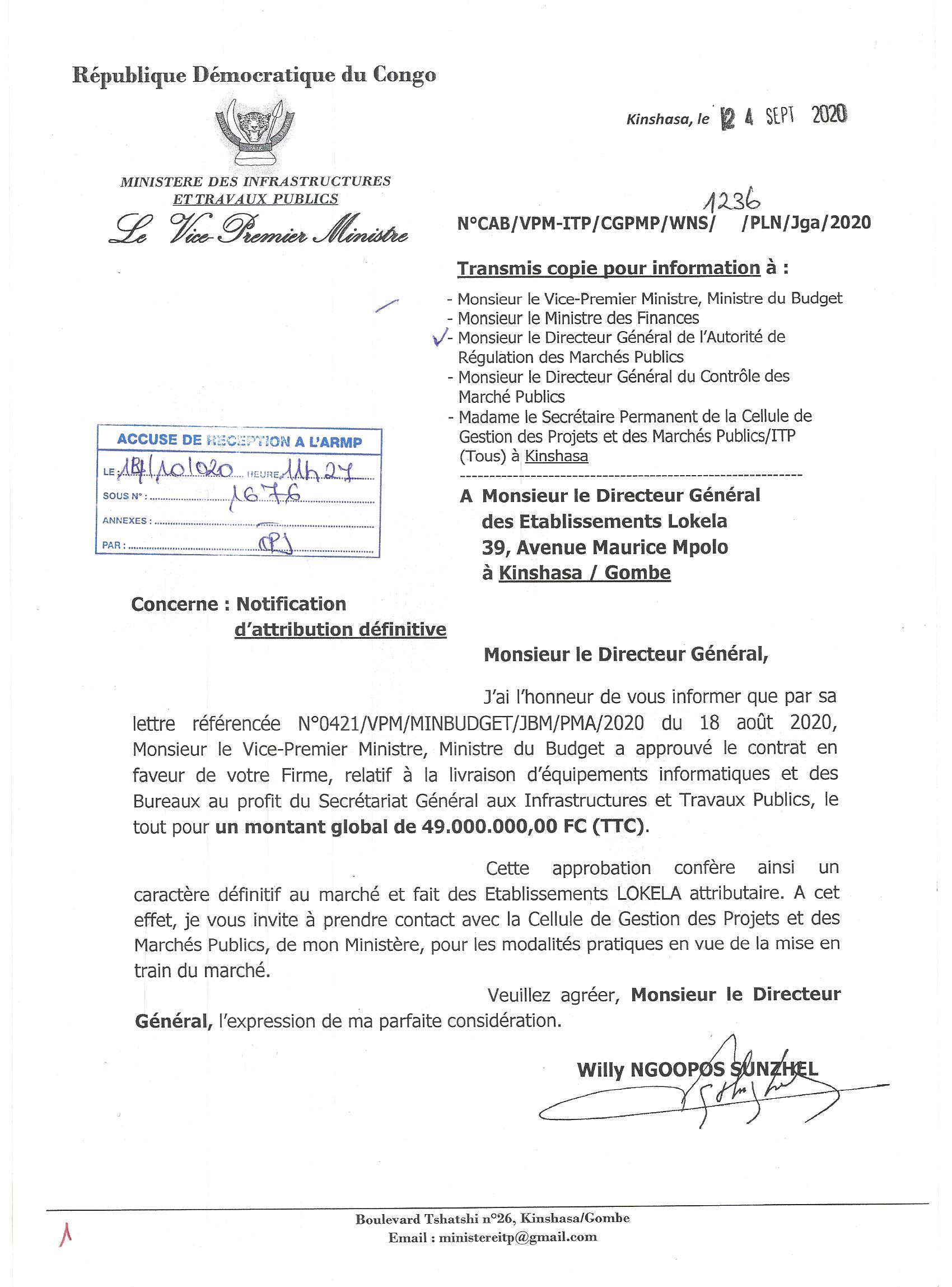 Attribution définitive du marché accordée à l’établissement lokela relative à la livraison d’équipements informatiques et des bureaux au profit du secrétariat général aux infrastructures et travaux publics