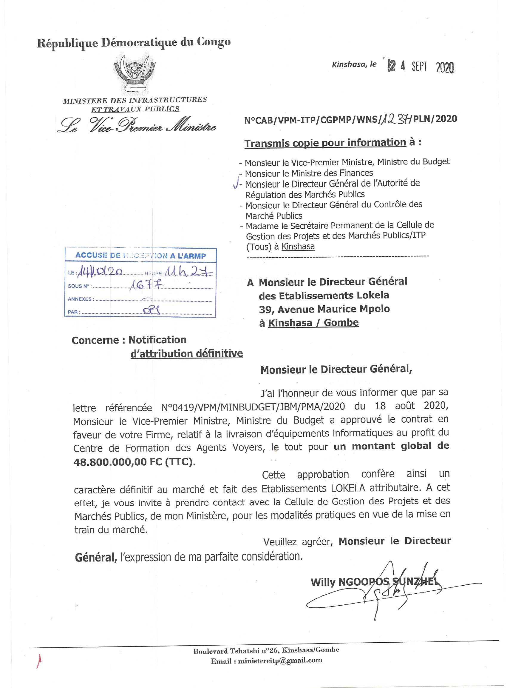 Attribution définitive du marché accordée à l’établissements lokela relative à la livraison d’équipements informatiques au profit du centre de formation des agents voyers.