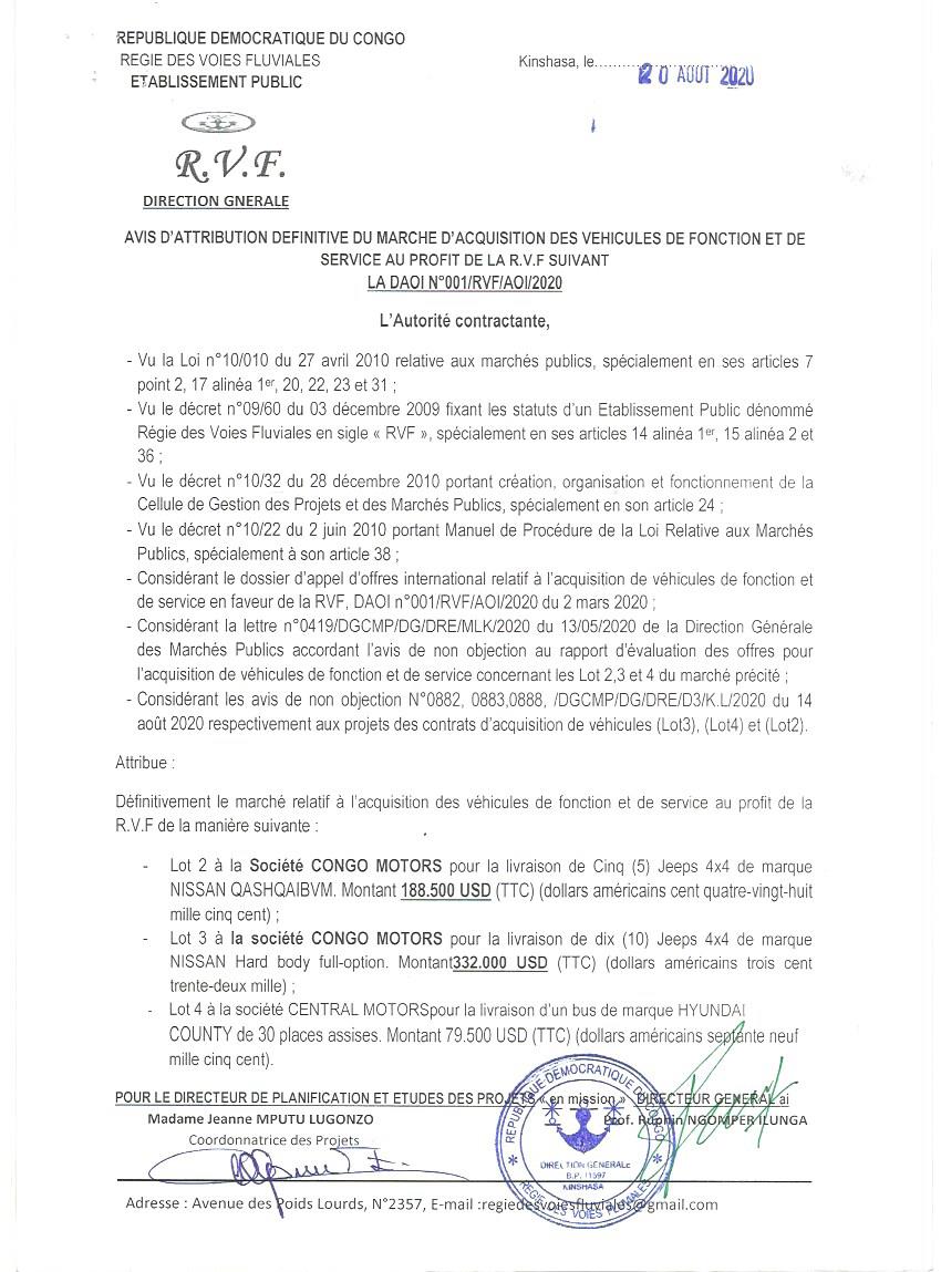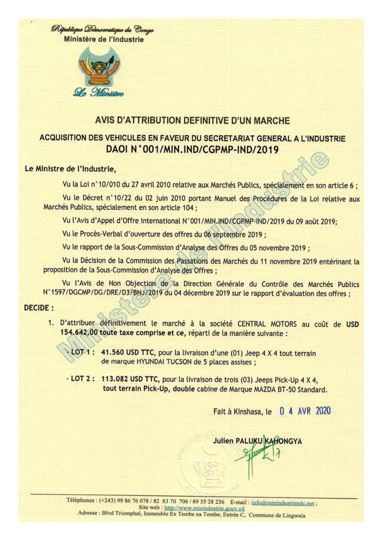 Attribution définitive du marché relatif à l’acquisition des véhicules en faveur du secrétariat général a l’industrie – daoi n° 001/min.ind/cgpmp/2019