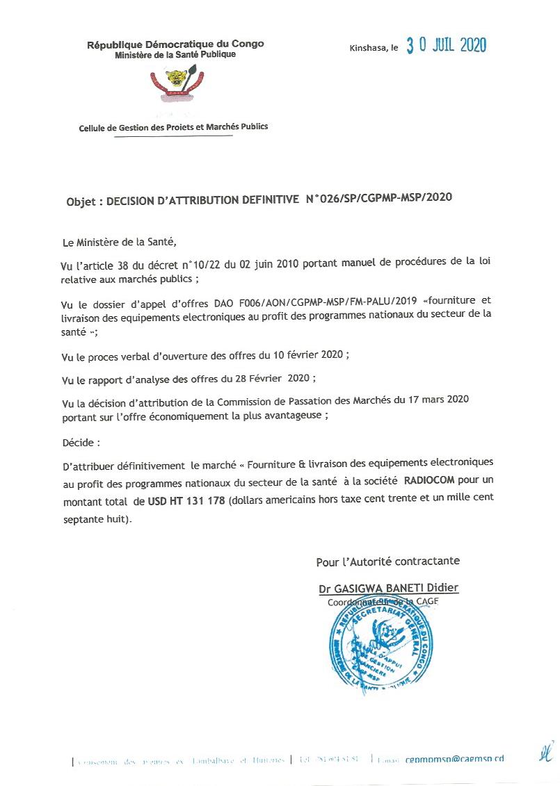 Attribution définitive de fourniture et livraison des équipements électroniques au profit des programmes nationaux du secteur de la santé à la société RADIOCOM.
