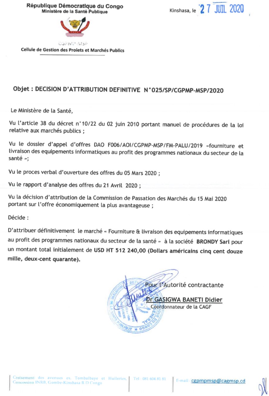 Attribution définitive du marché relatif à la fourniture et livraison des équipements informatiques au profit des programmes nationaux du secteur de la sante a la société BRONDY SARL