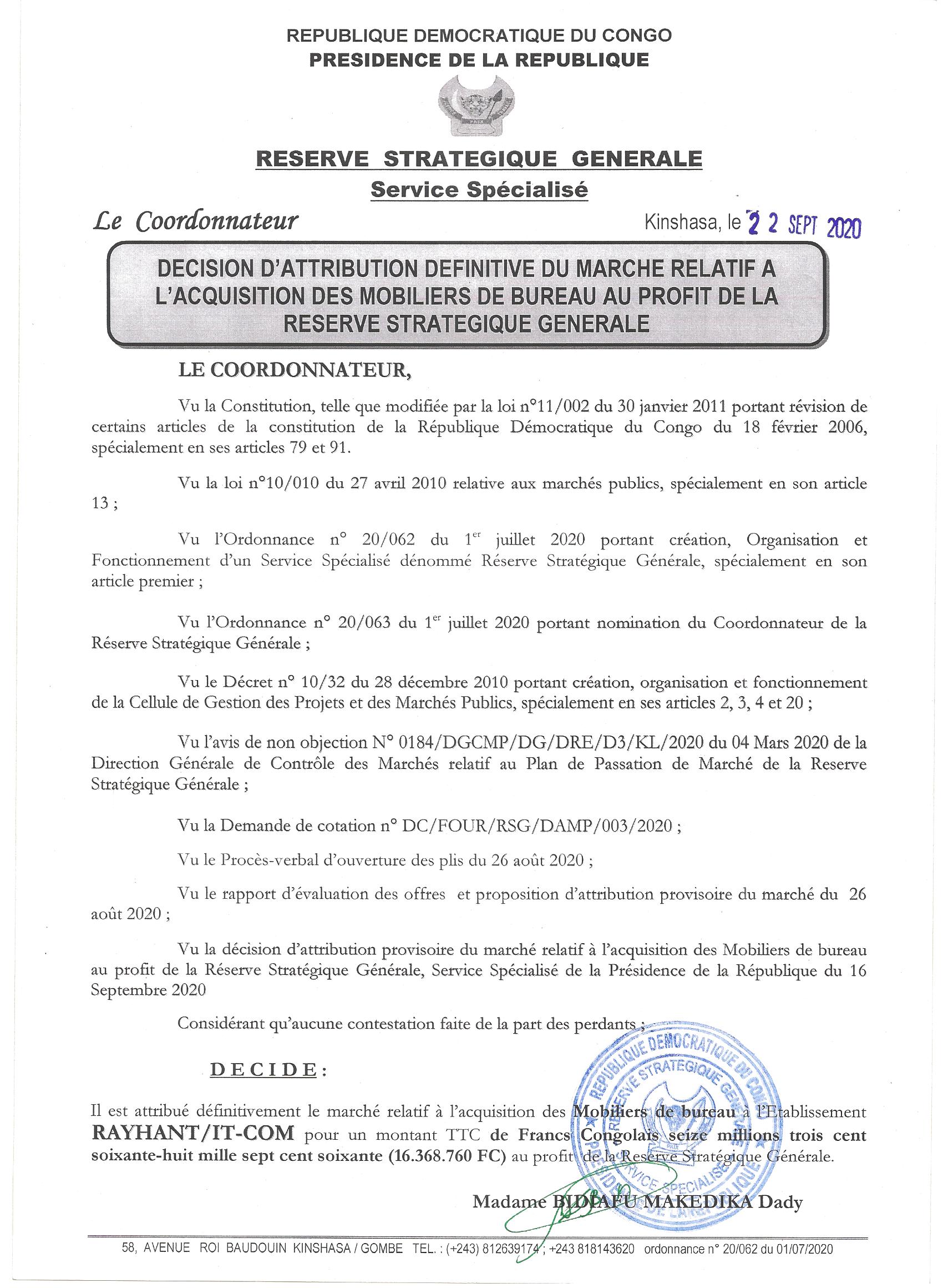Attribution définitive du marché accordé à rayhant/ it-com relative à l’acquisition des mobiliers de bureau au profit de la réserve stratégique générale.