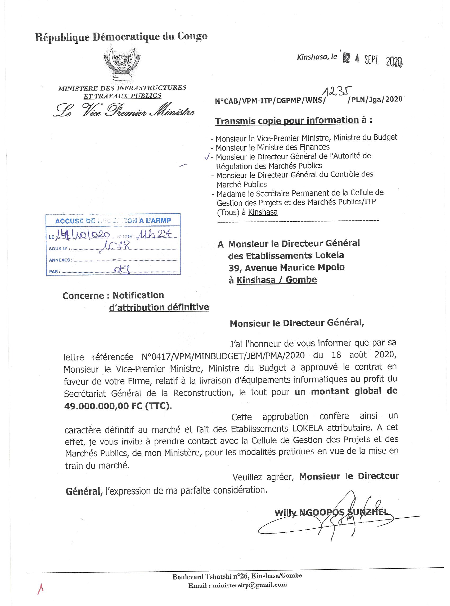 Attribution définitive du marché accordée à l’établissements lokela relative à la livraison d’équipements informatiques au profit du secrétariat général de la reconstruction.