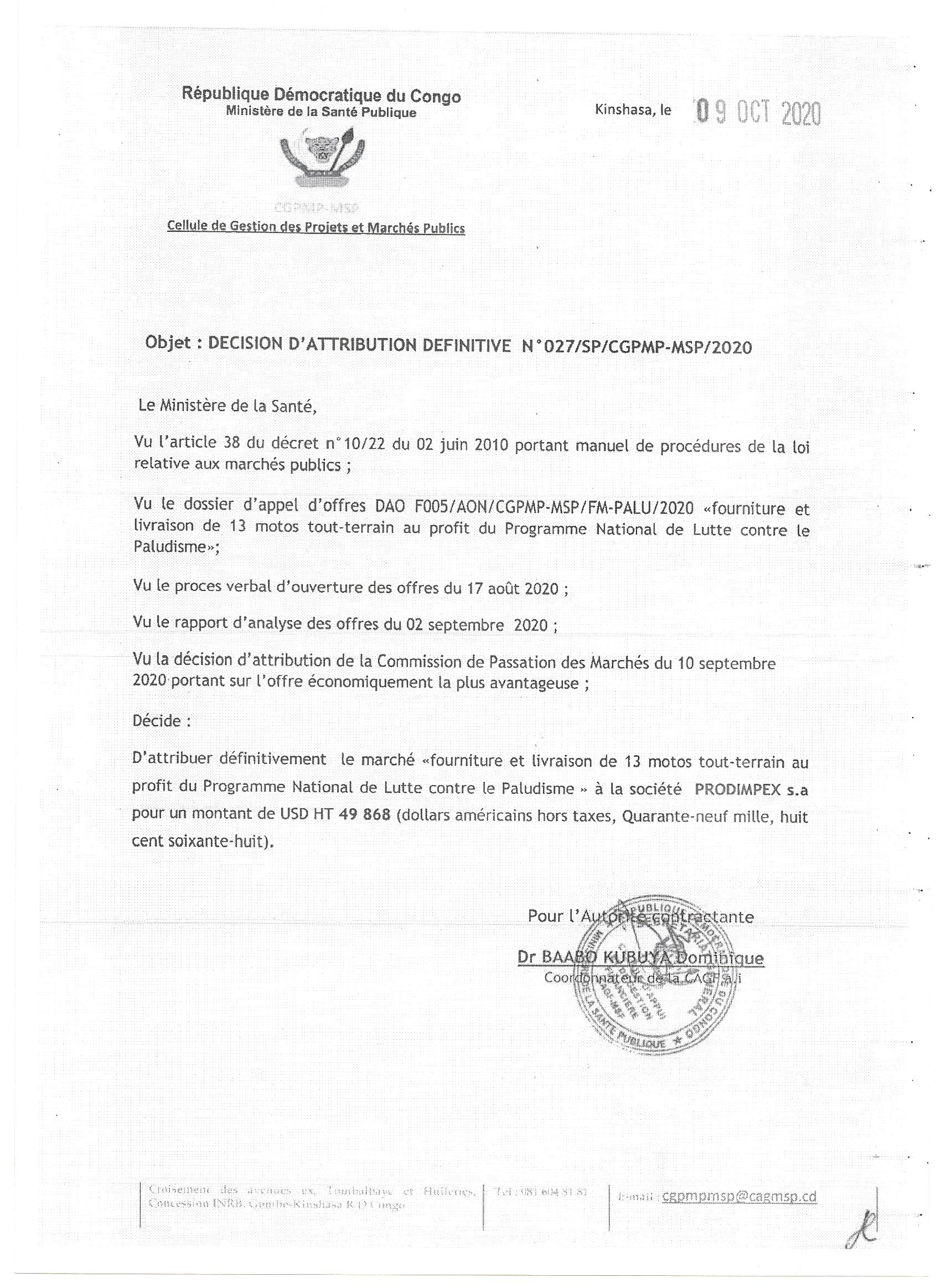 Attribution définitive accordée à la Société PRODIMPEX s.a relative au marché de «fourniture et livraison de 13 motos tout-terrain au profit du programme national de lutte contre le paludisme»