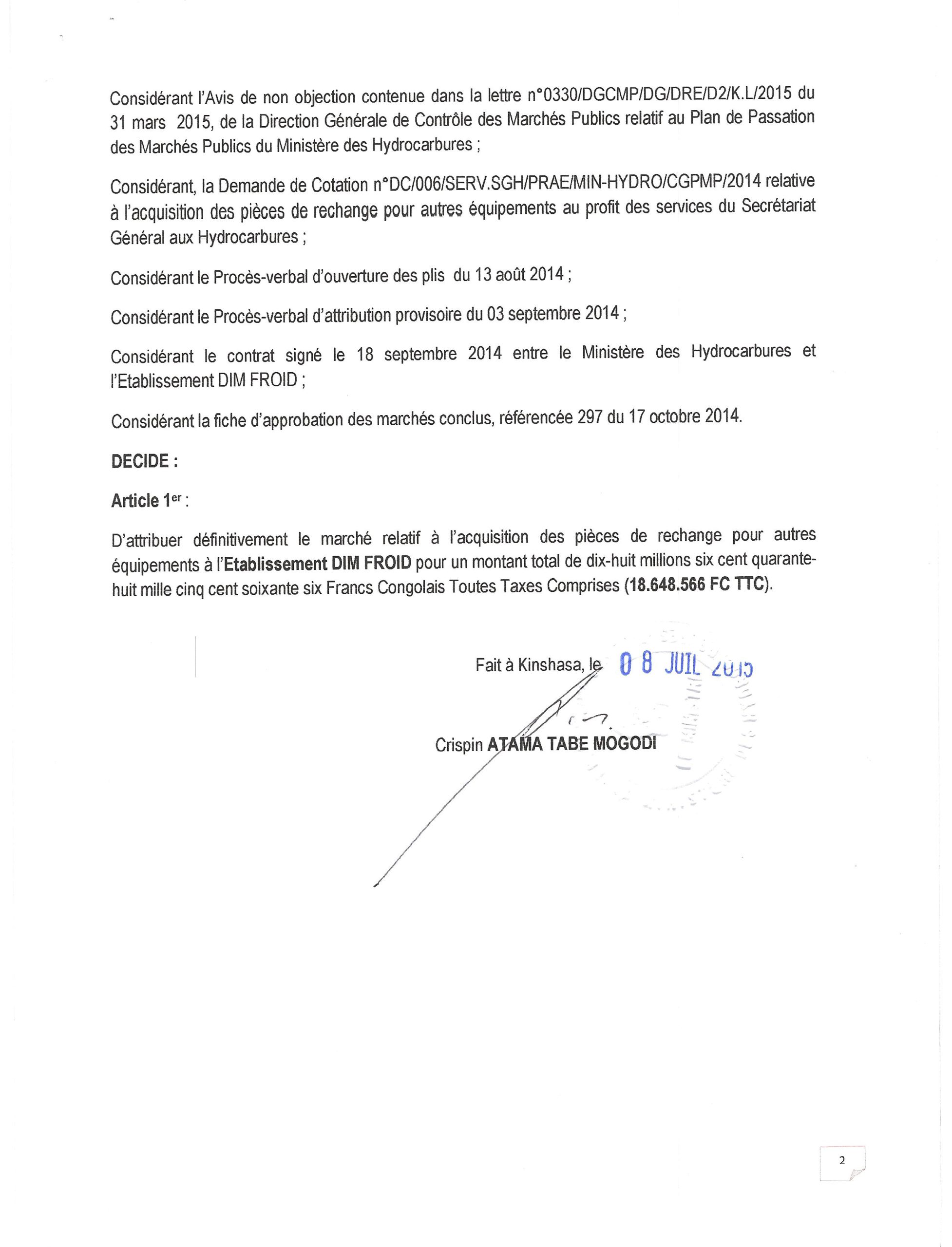 Attribution définitive accordée à l’Etablissement DIM FROID du marché relatif à l’acquisition des pièces de rechange pour autres équipements au profit des services du secrétariat général aux hydrocarbures.