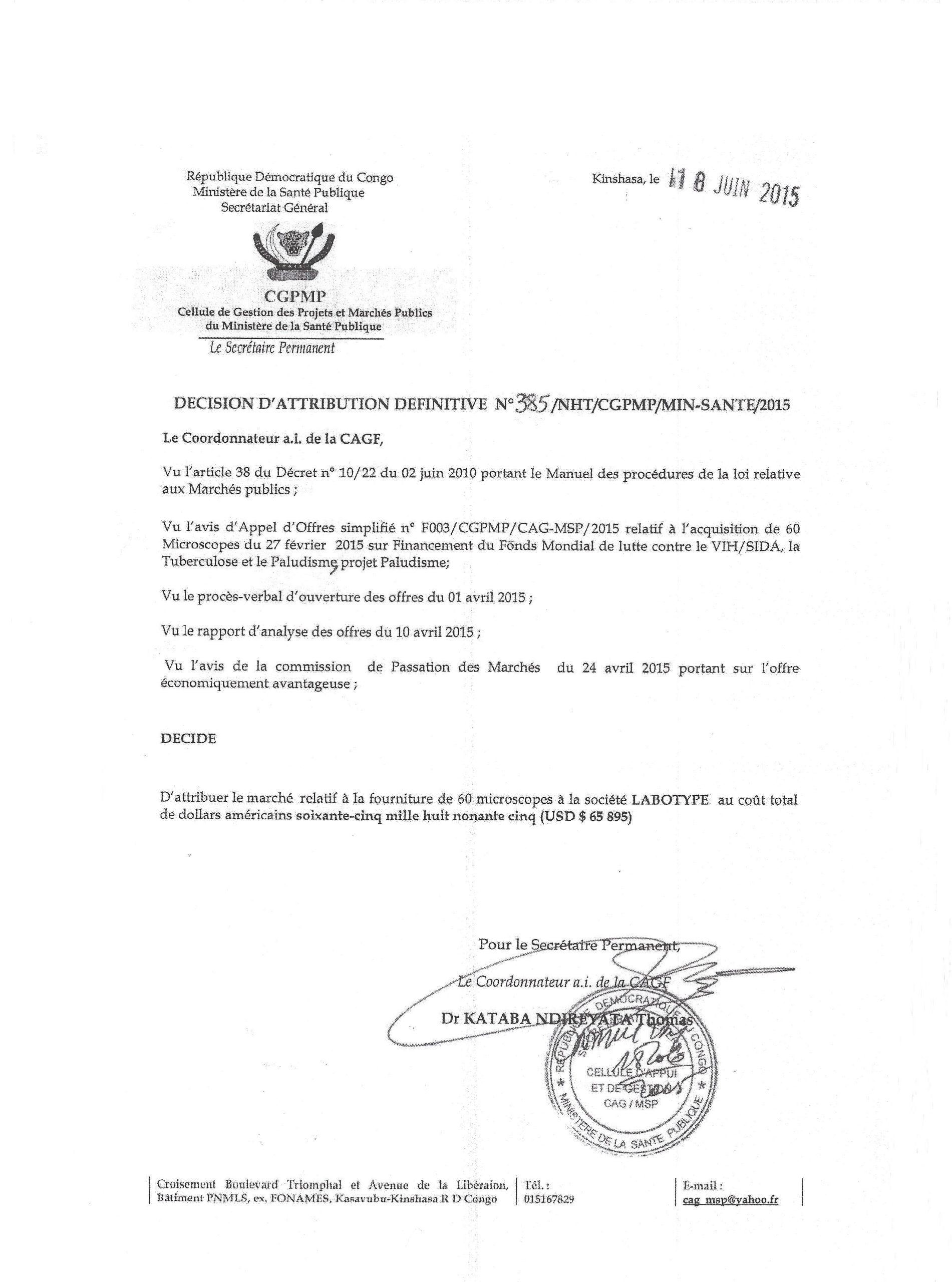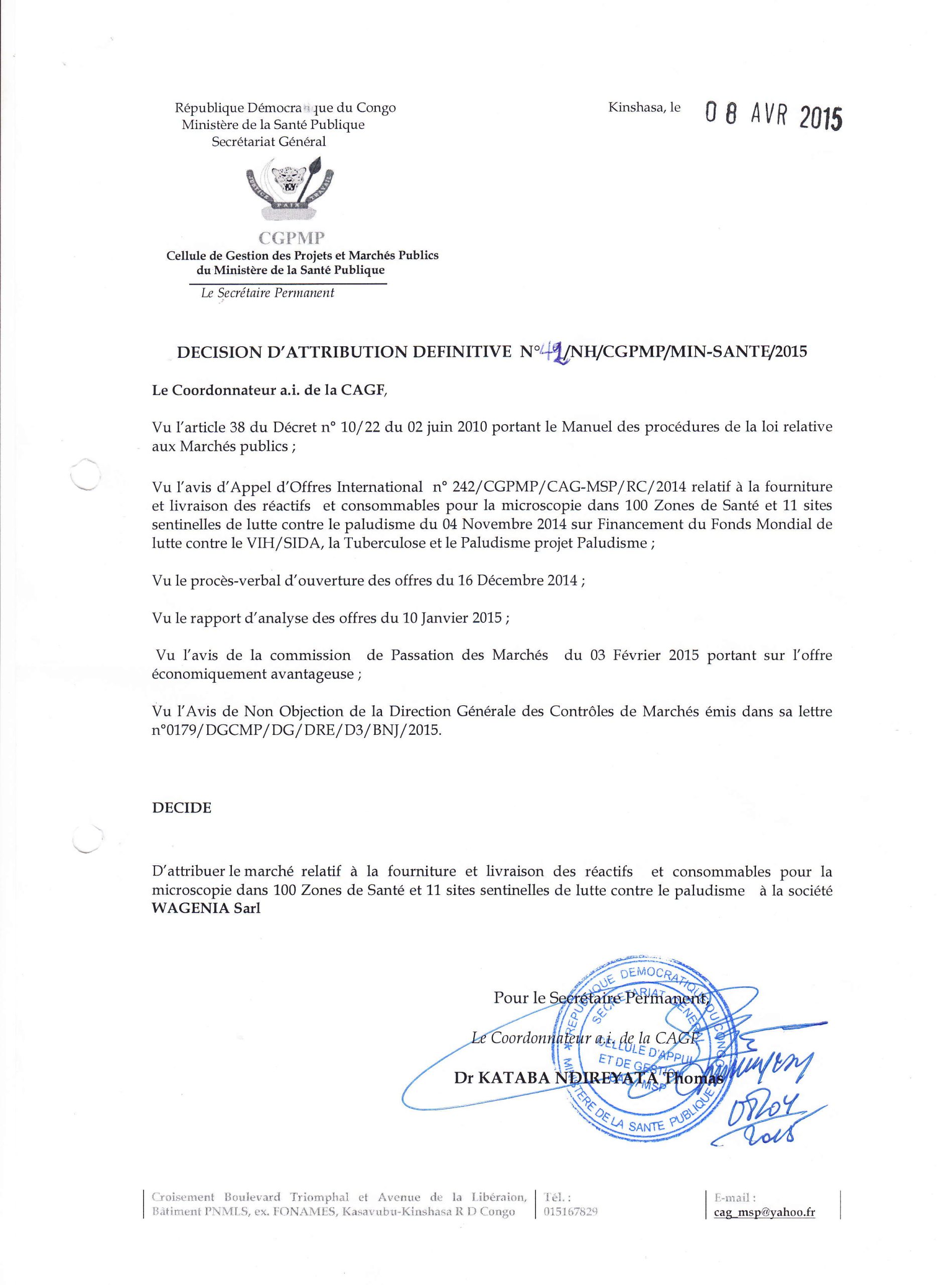 Attribution définitive accordée à la société MAGENIA Sarl du marché relatif à la fourniture et livraison des réactifs et consommables pour la microscopie dans 100 zones de santé et 11 sites sentinelles de lutte contre le paludisme.