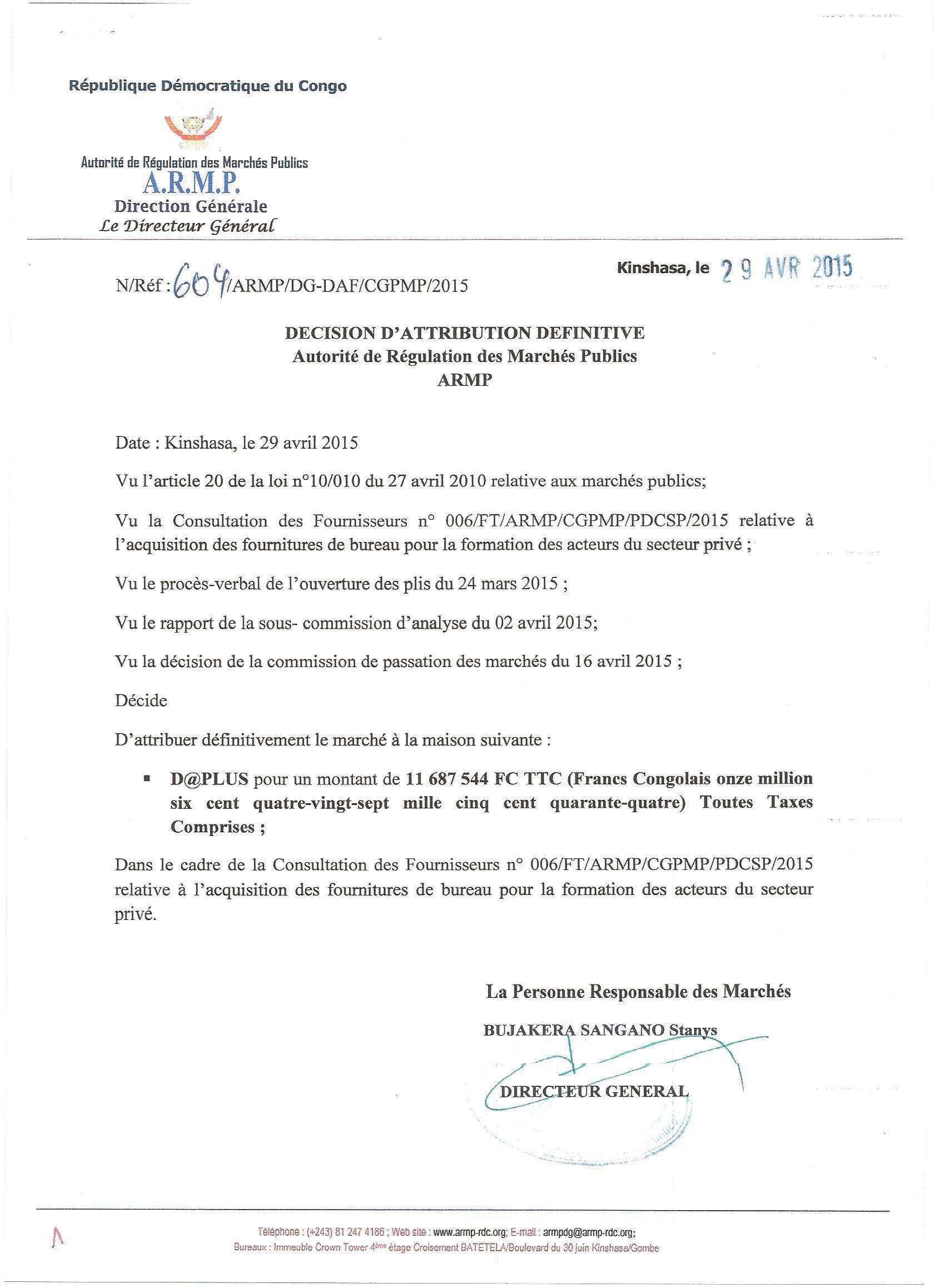 Attribution définitive accordée au fournisseur MALAMBA Business du marché relatif à l’acquisition des fournitures de bureau et consommables informatiques pour le fonctionnement des directions de lac-Sarl à Kinshasa.