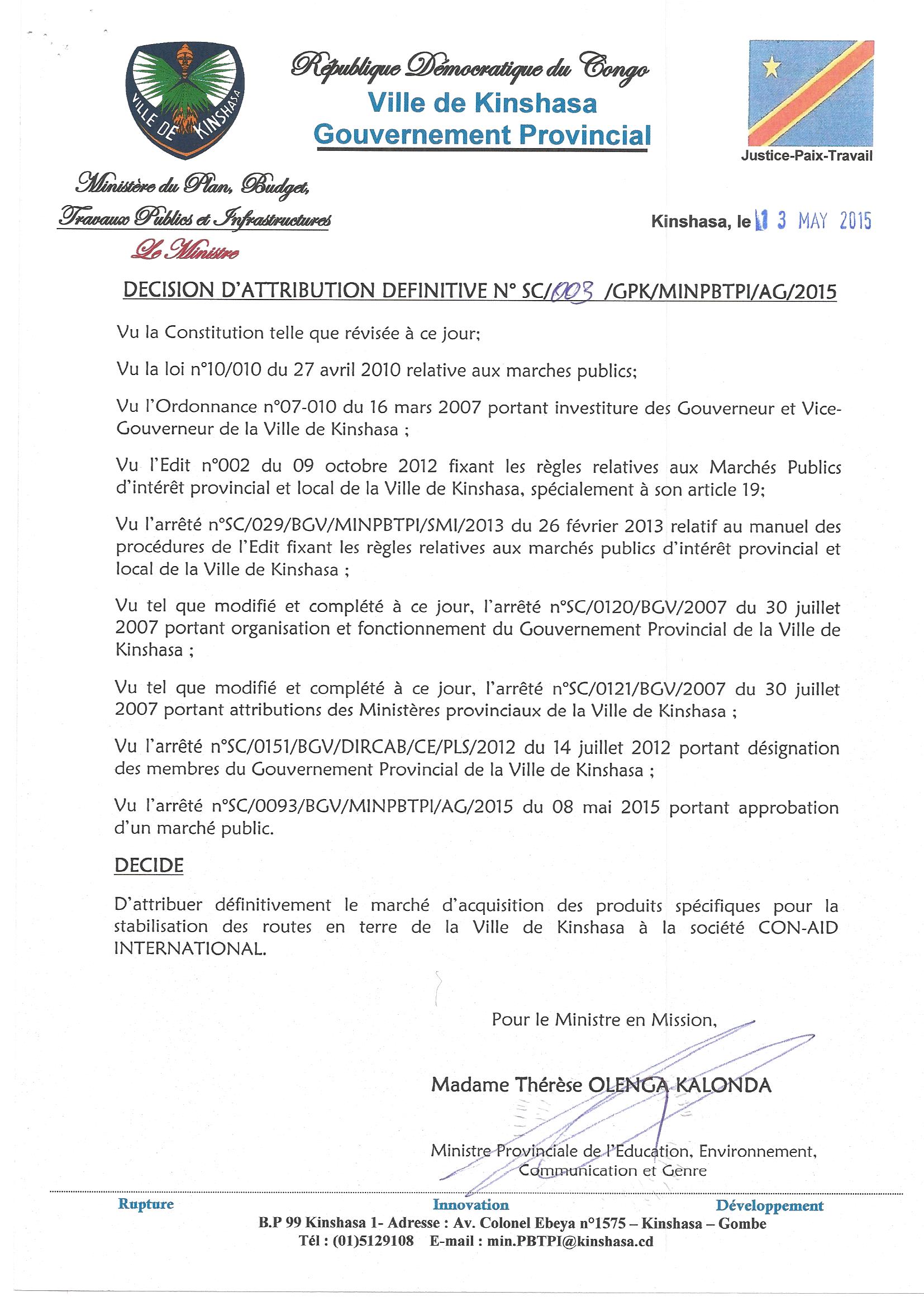 Attribution définitive accordée à la société CON-AID INTERNATIONAL du marché relatif à l’acquisition des produits spécifiques pour la stabilisation des routes en terre de la ville de Kinshasa.
