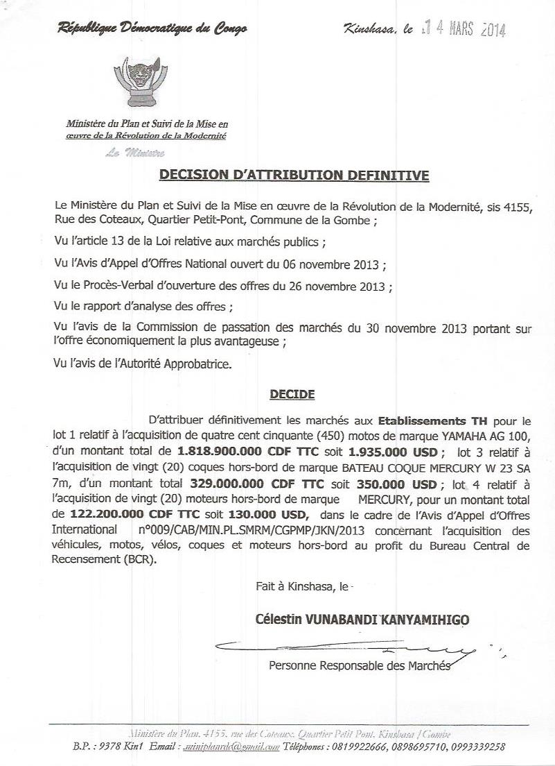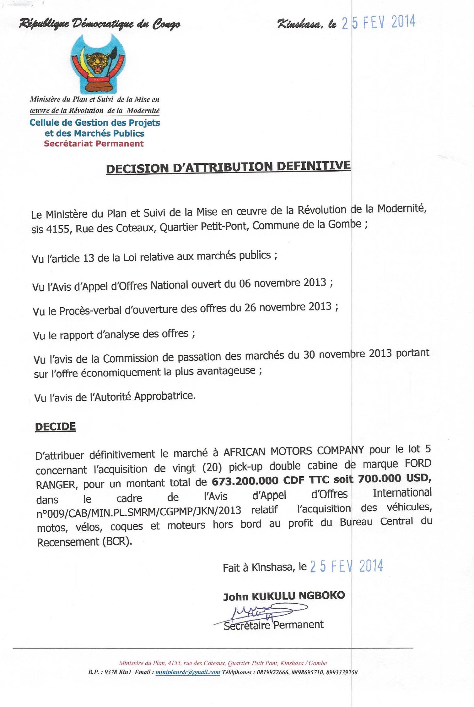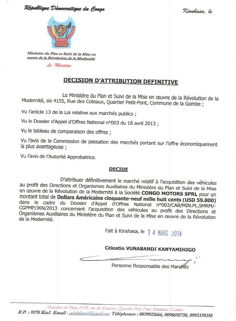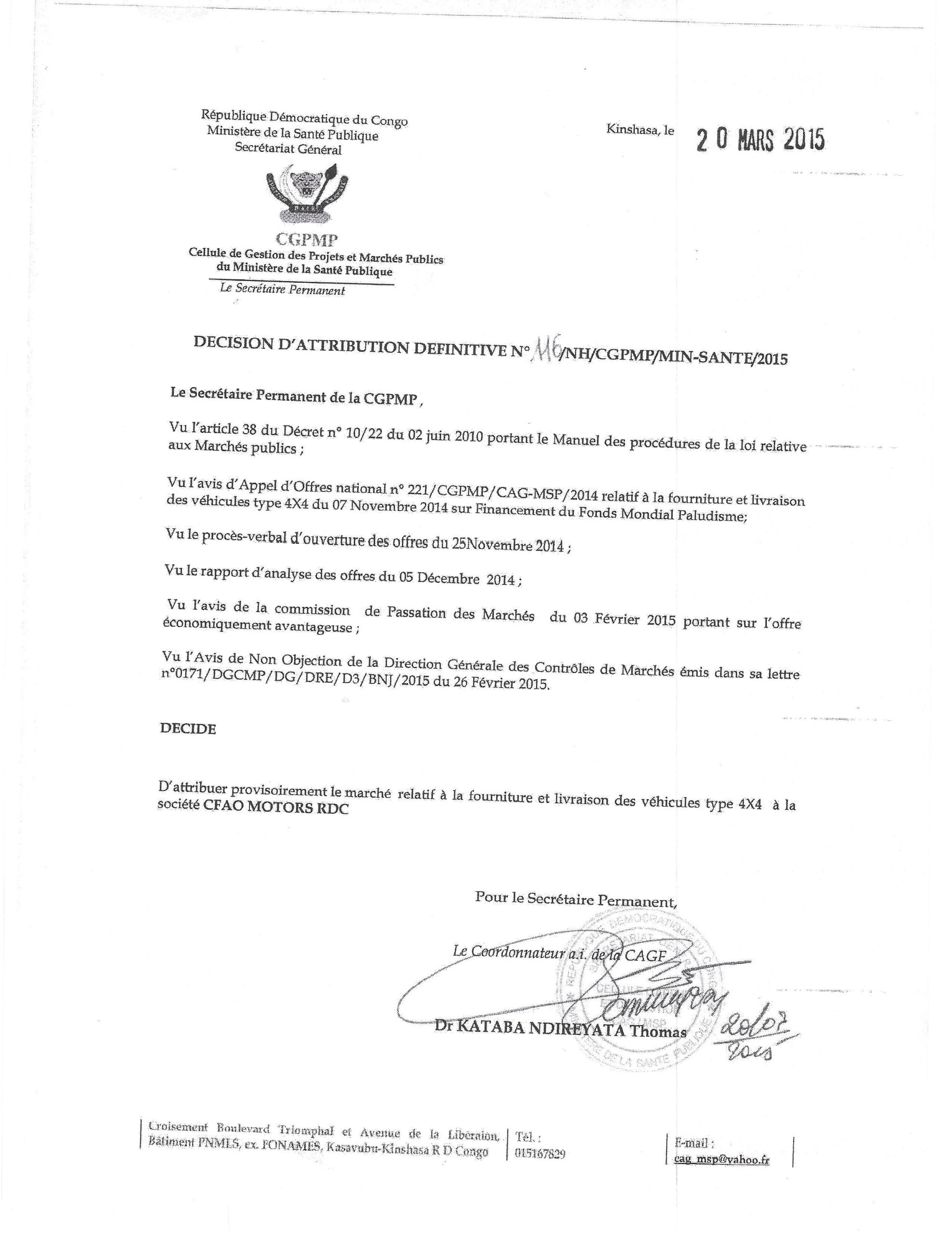 ATTRIBUTION DÉFINITIVE ACCORDEE À LA SOCIÉTÉ CFAO MOTORS RDC RELATIF À LA FOURNITURE ET LIVRAISON DES VÉHICULES TYPE 4X4.