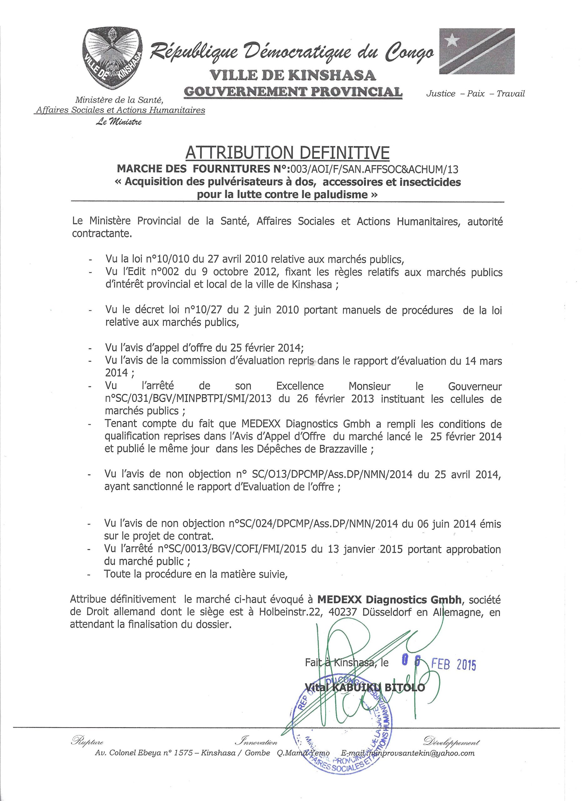 ATTRIBUTION DÉFINITIVE ACCORDEE À MEDEXX DIAGNOSTICS GMBH RELATVE AU MARCHÉ D’ACQUISITION DES PULVÉRISATEURS À DOS, ACCESSOIRES ET INSECTICIDES POUR LA LUTTE CONTRE LE PALUDISME