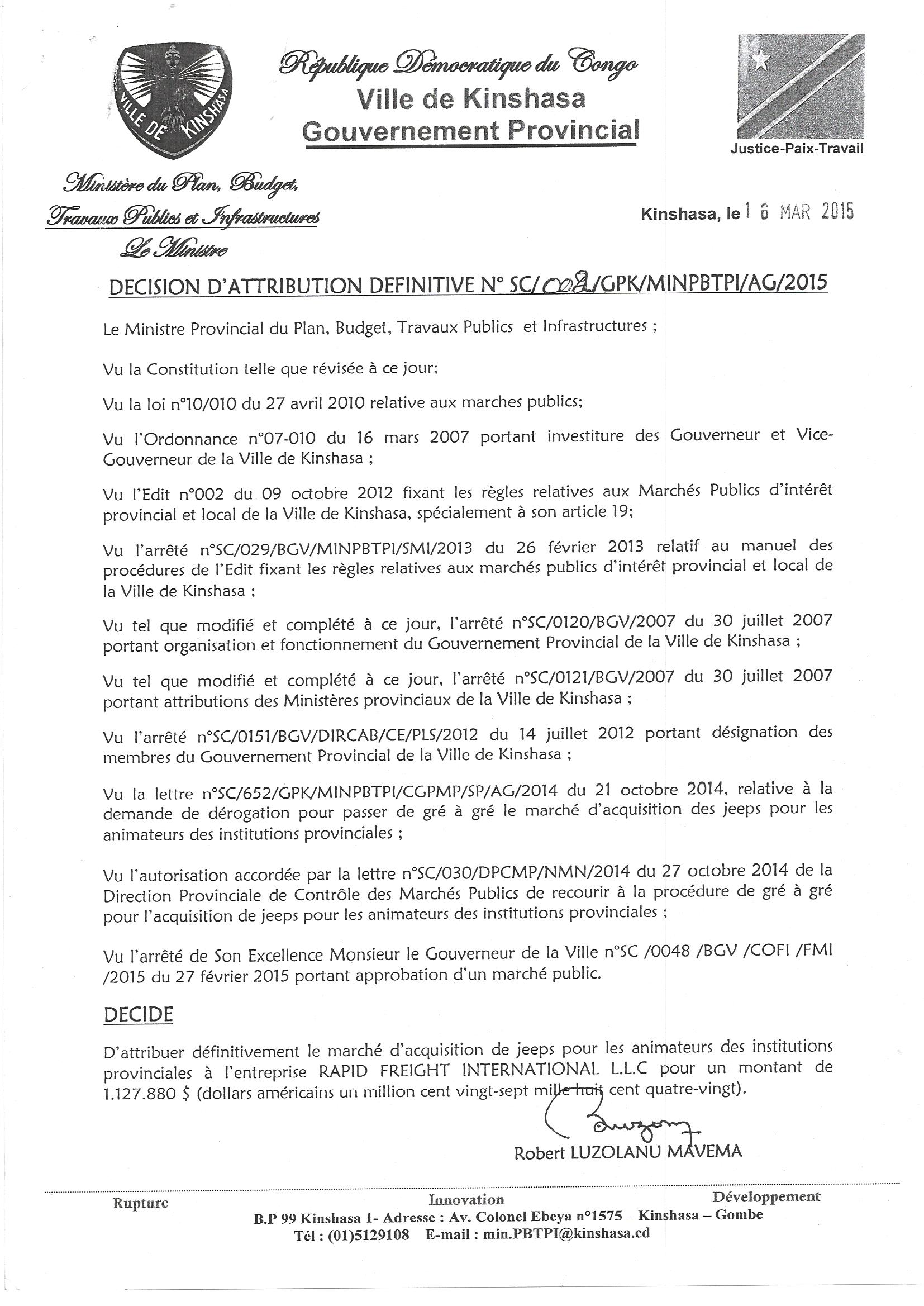 ATTRIBUTION DÉFINITIVE DU MARCHÉ D’ACQUISITION DE JEEPS POUR LES ANIMATEURS DES INSTITUTIONS PROVINCIALES ACCORDEE À L’ENTREPRISE RAPID FREICHT INTERNATIONAL LLC.