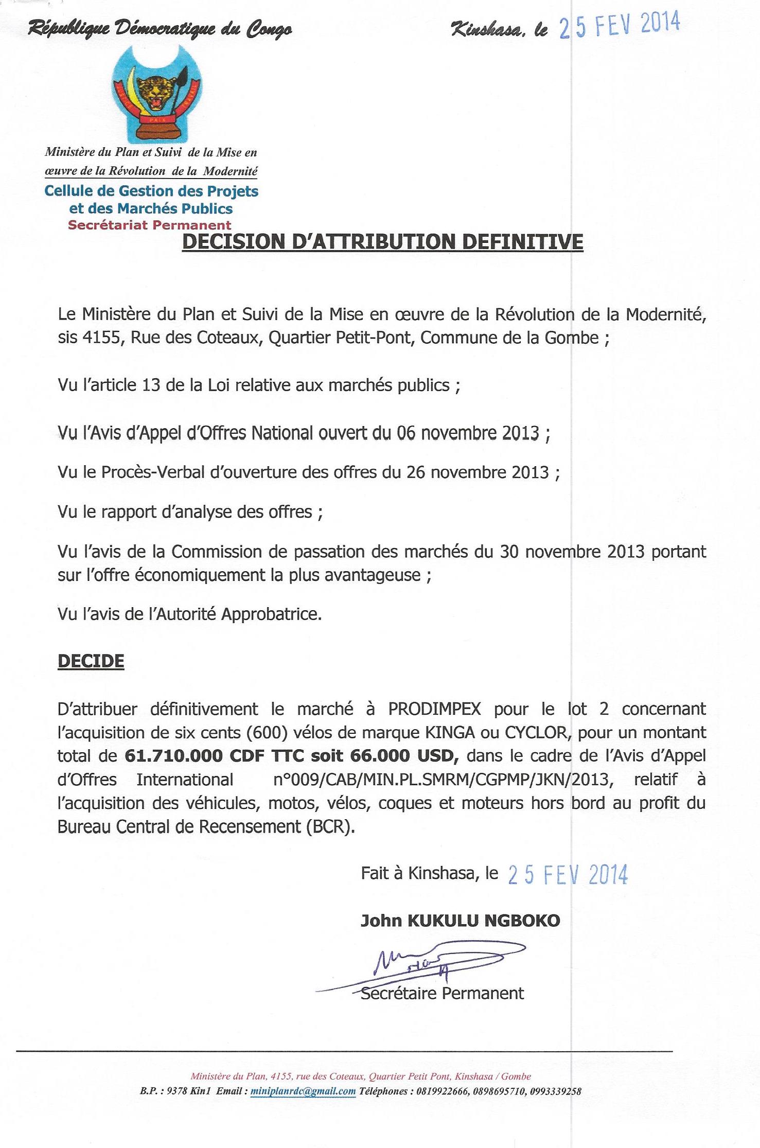 Attribution définitive du marché relatif à l’acquisition des véhicules, motos, vélos.. à PRODIMPEX.