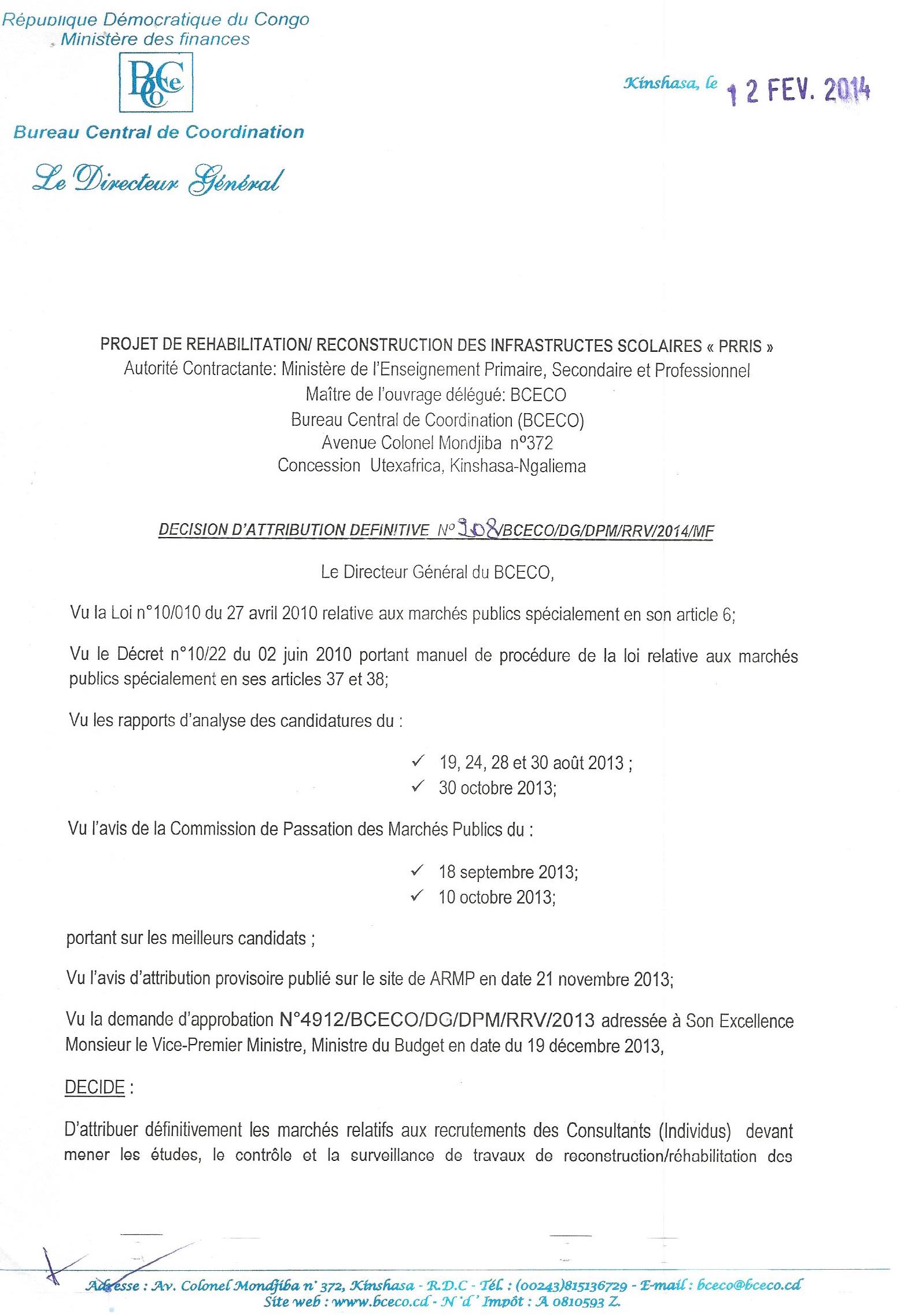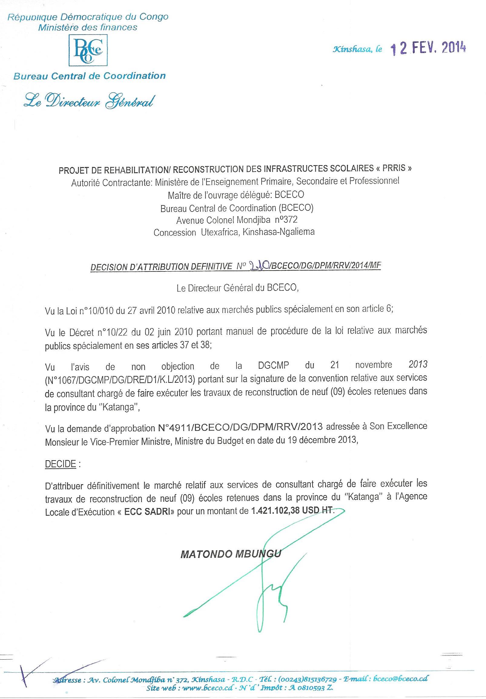 Attribution définitive du marché relatif aux services de consultant chargé de faire exécuter les travaux de reconstruction de neuf (09) écoles retenues dans la province du Katanga à l’ALE “ECC SADRI”