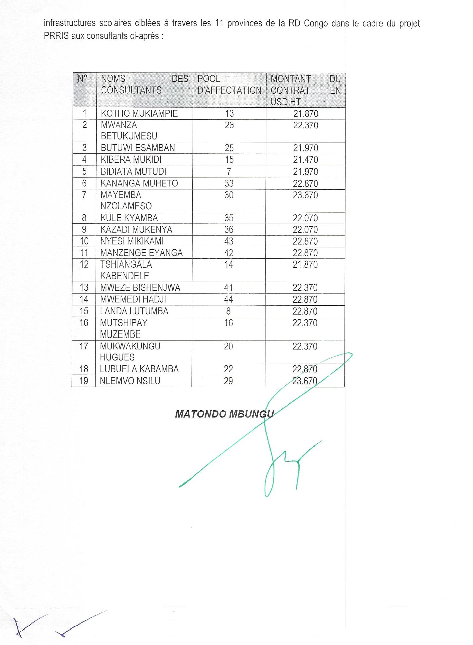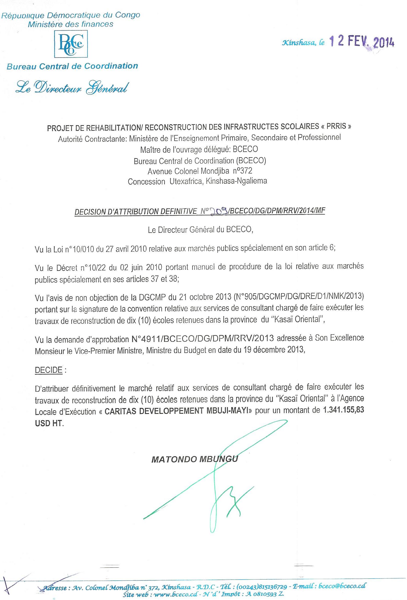 Attribution définitive du marché relatif aux services de consultant chargé de faire exécuter les travaux de reconstruction de dix (10) écoles retenues dans la province du KasaÏ Oriental à l’ALE” CARITAS DEVELOPPEMENT MBUJI-MAYI