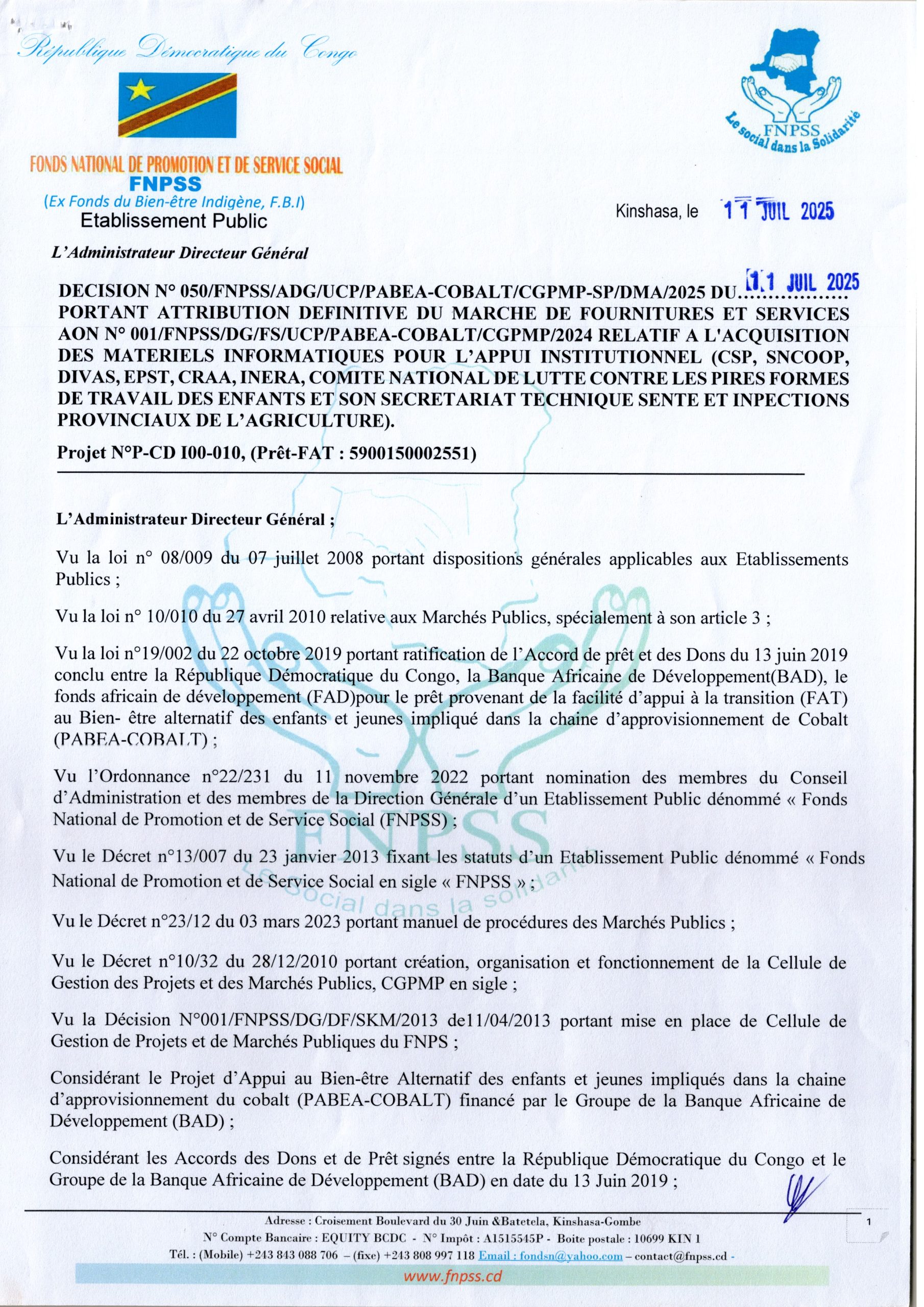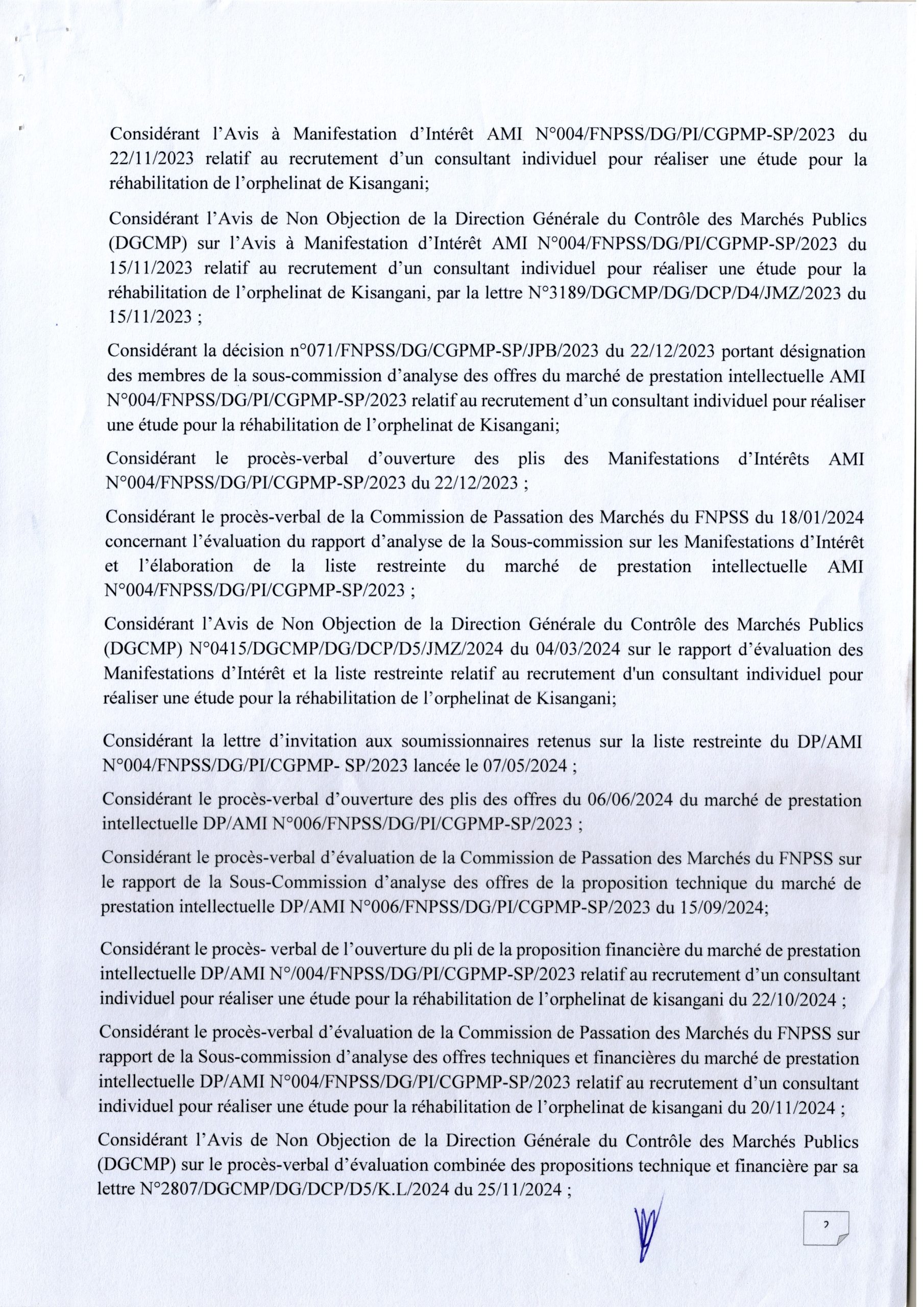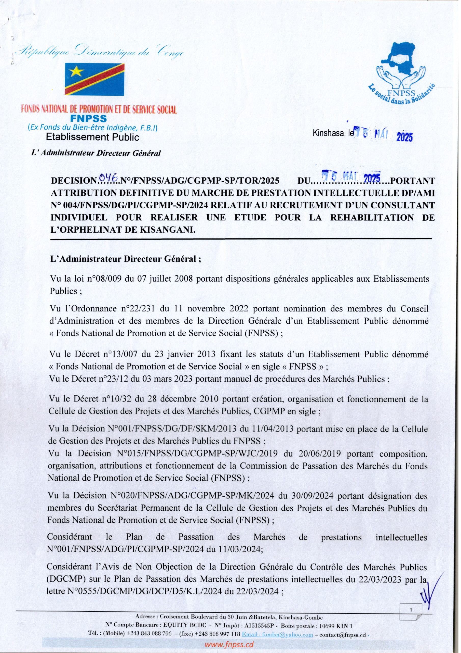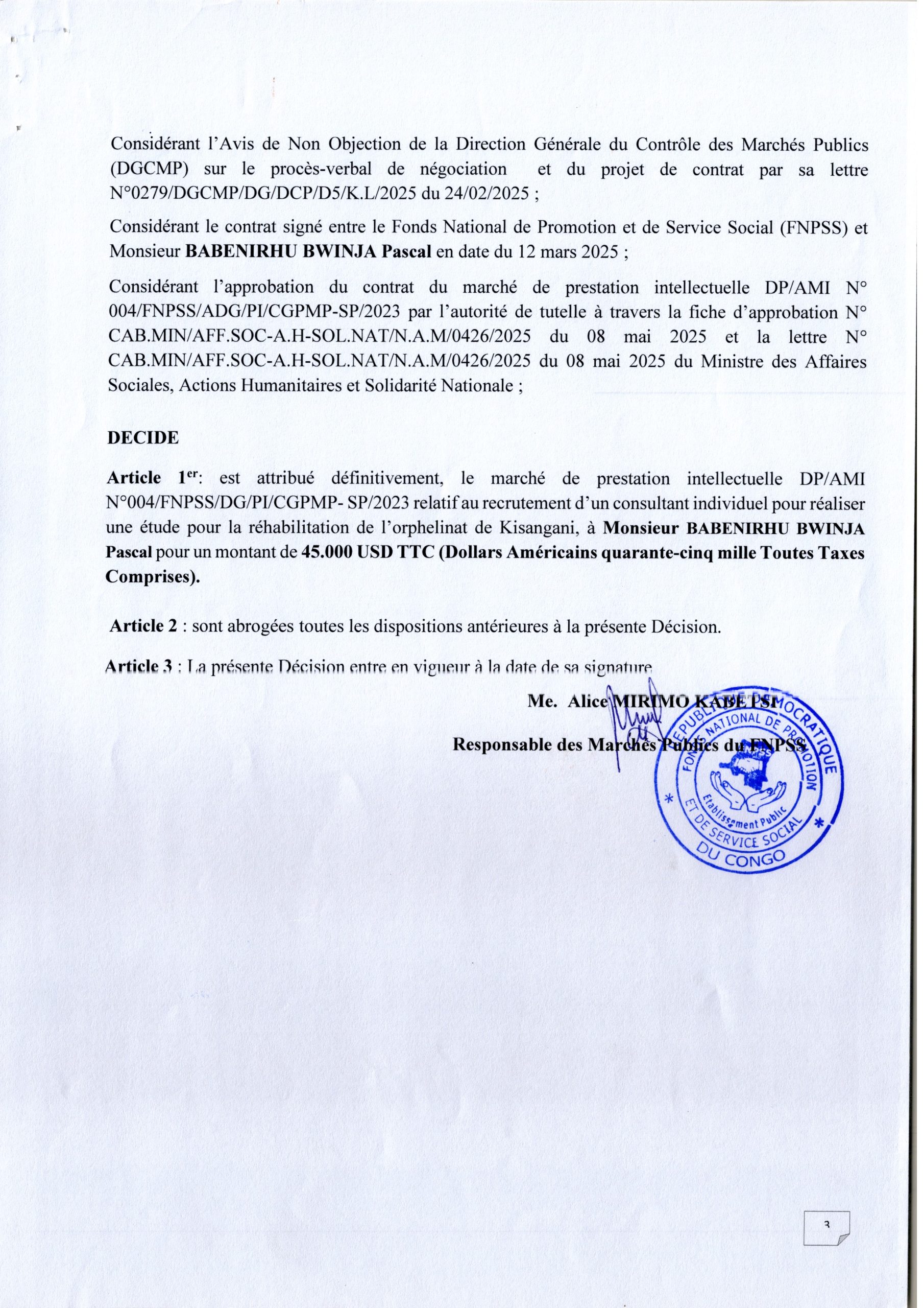 Attribution définitive accordée à Mr BABENIRHU BWINJA Pascal relative au recrutement d’un consultant individuel pour réaliser une étude pour la réhabilitation de l’orphelinat de Kisangani.