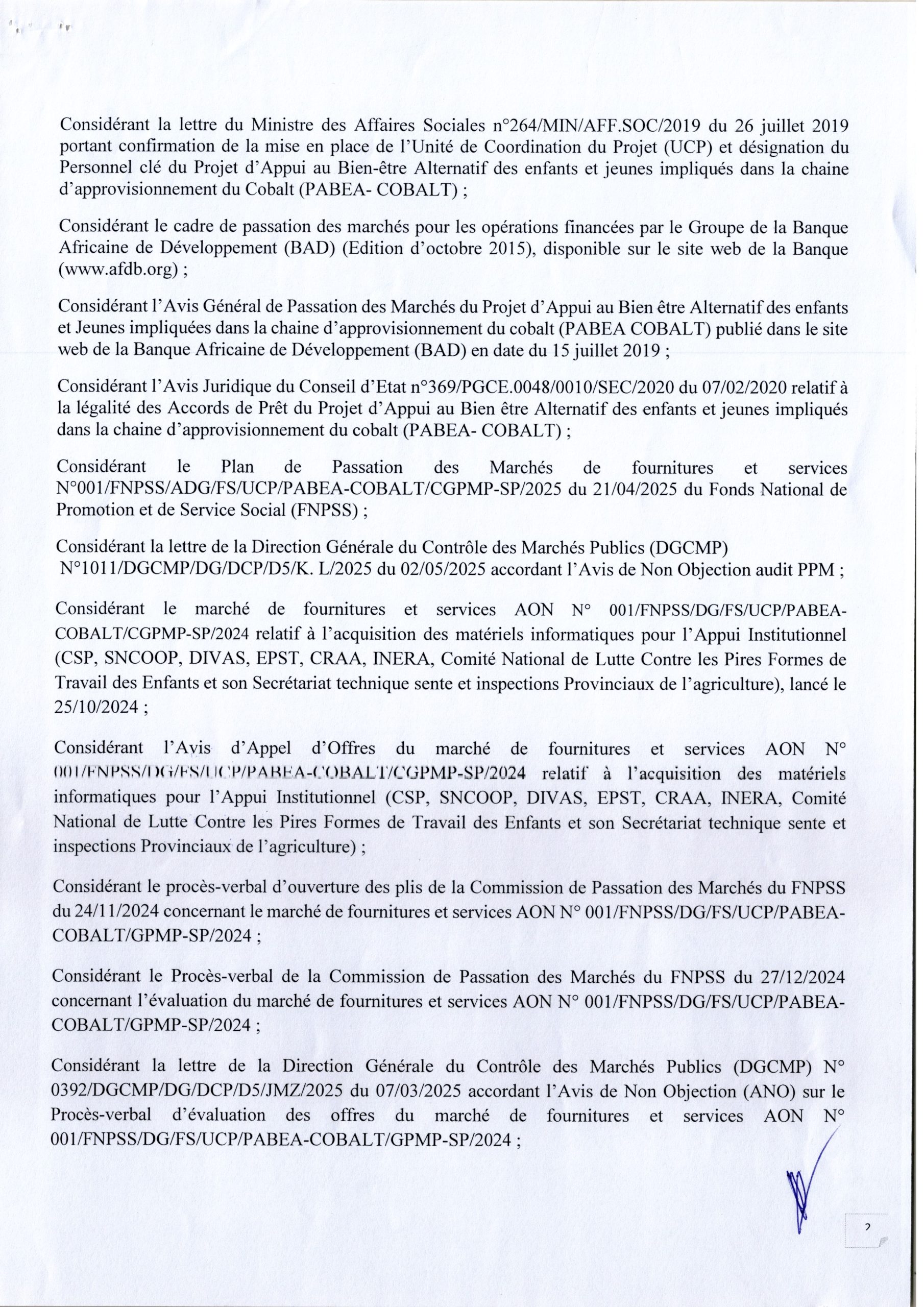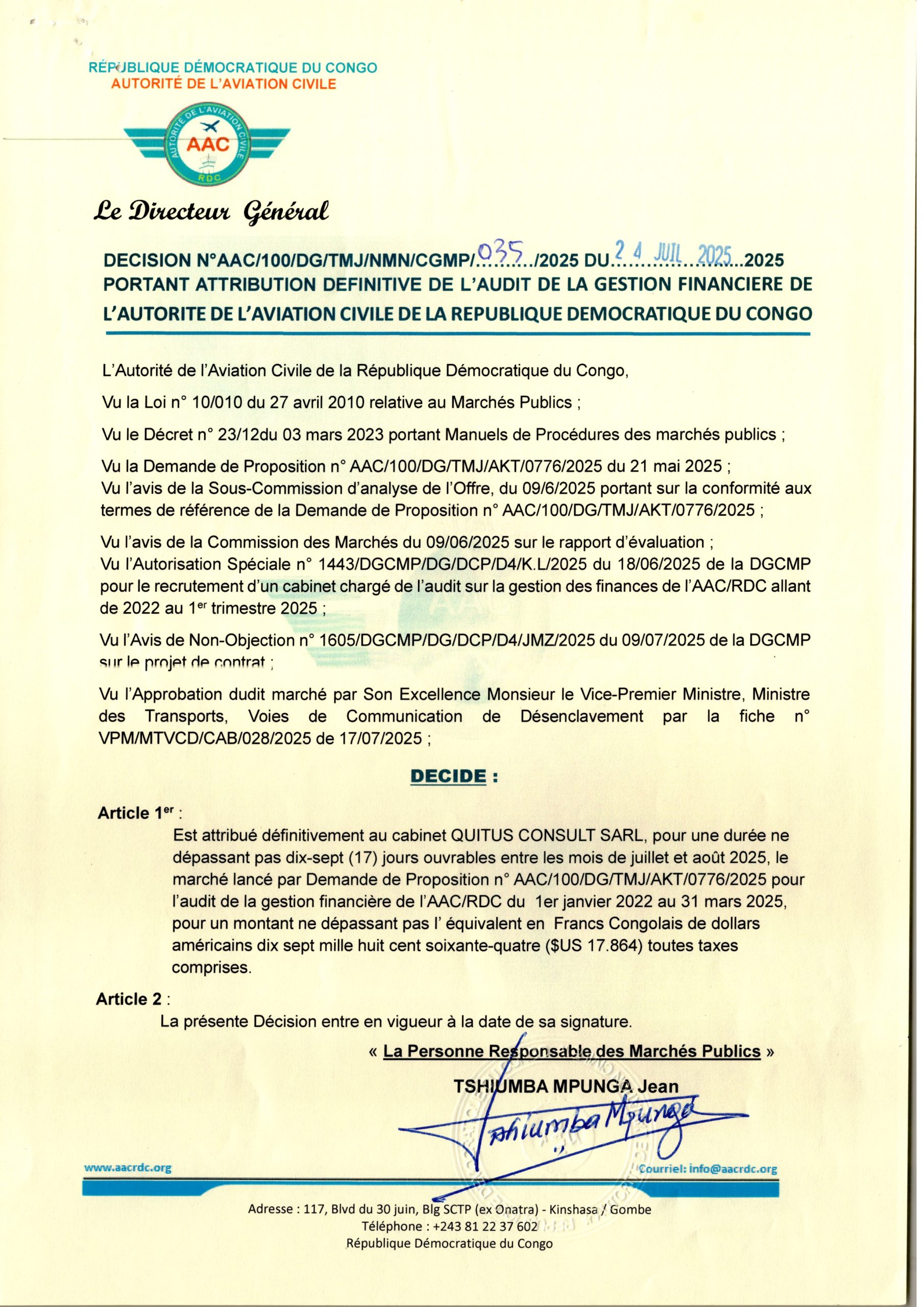 Attribution définitive accordée au cabinet QUITUS CONSULT relative à l’audit de la gestion financières de l’AAC/RDC du 1er janvier 2022 au 31 mars 2025….