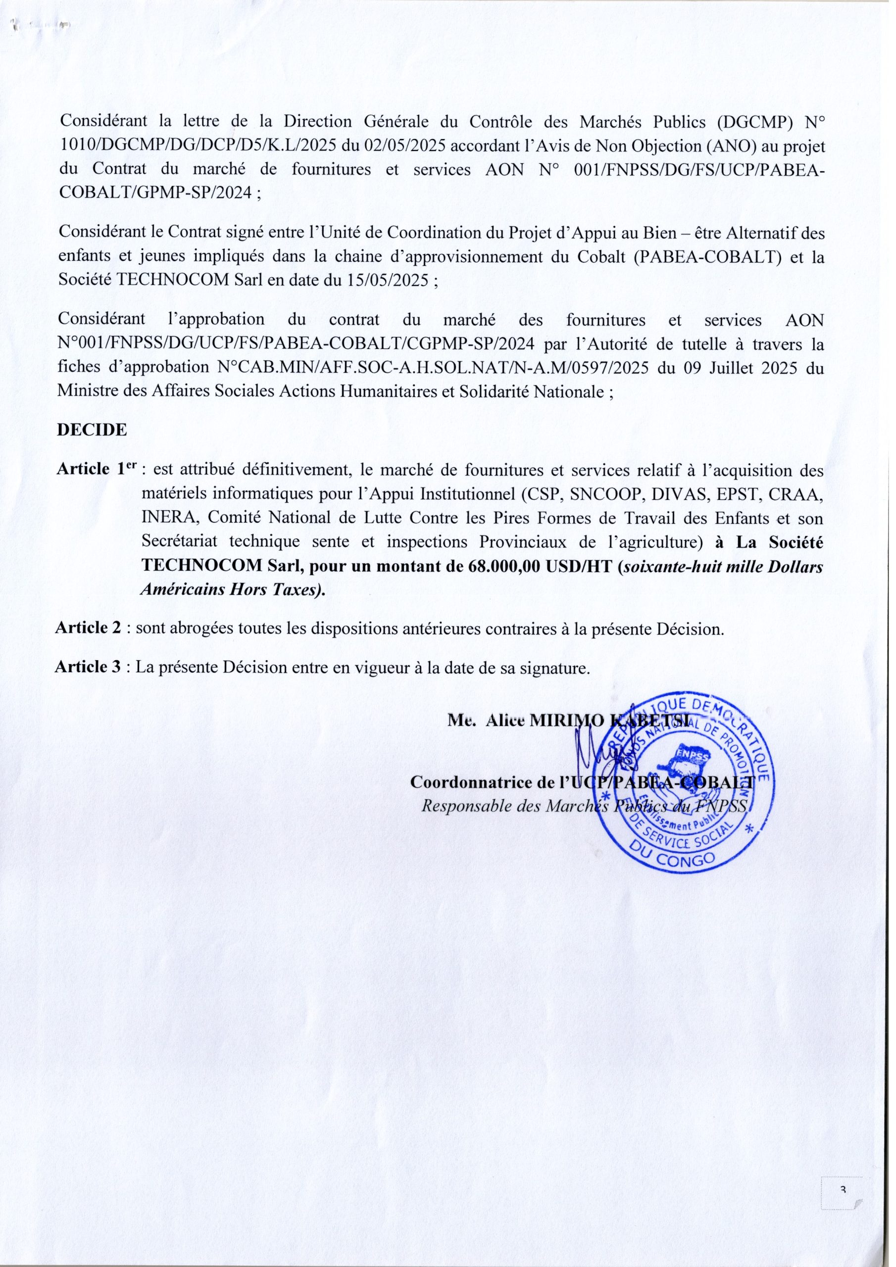 Attribution définitive accordée à la société TECHNOCOM Sarl marché de fourniture relatif à l’acquisition des matériels informatiques pour l’appui institutionnel (CSP, SNCOOP, DIVAS, EPST, CRAA, INERA, Comité National de Lutte Contre les Pires Formes de Travail des Enfants et son Secrétariat techniques sente et inspections Provinciaux de l’agriculture).