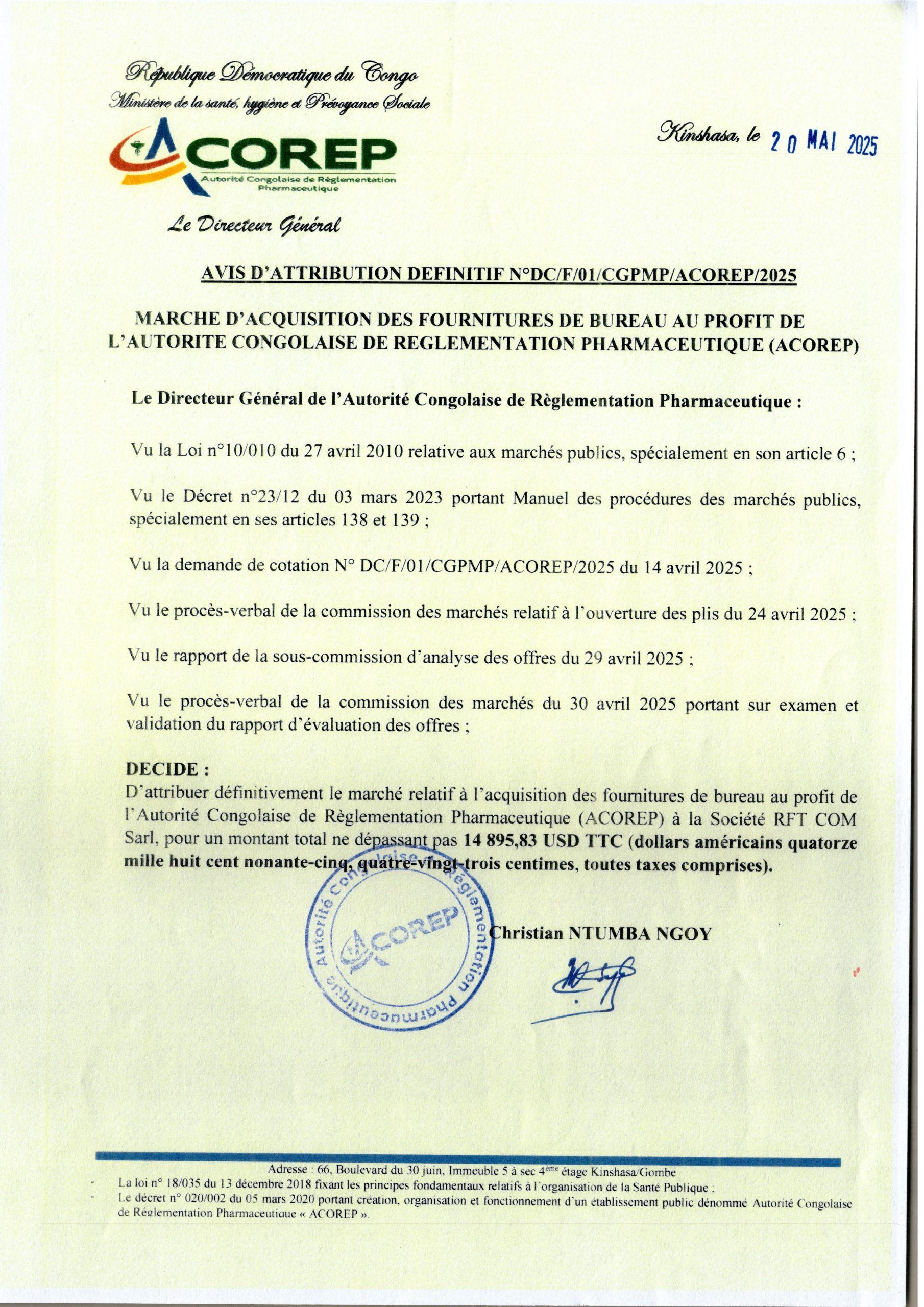 Attribution Définitif du Marché d’acquisition des Fournitures de Bureau au Profit de l’Autorité Congolaise de Règlementation Pharmaceutique (ACOREP) à la Société RFT COM Sarl