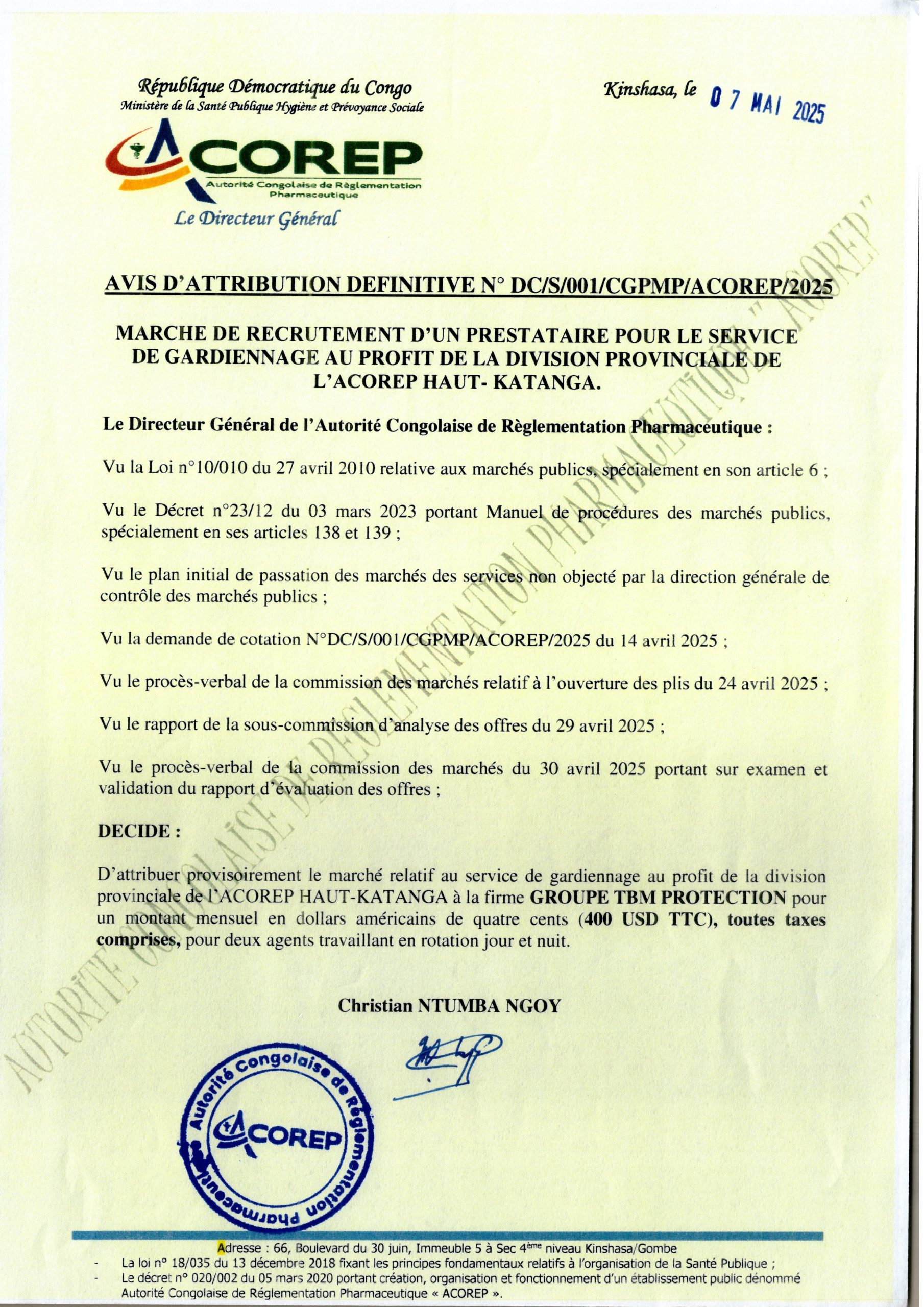 Attribution définitif du marché de Recrutement d’un Prestataire pour le service de Gardiennage au Profit de la Division Provinciale de l’ACOREP Haut-Katanga à la Firme GROUPE TBM PROTECTION