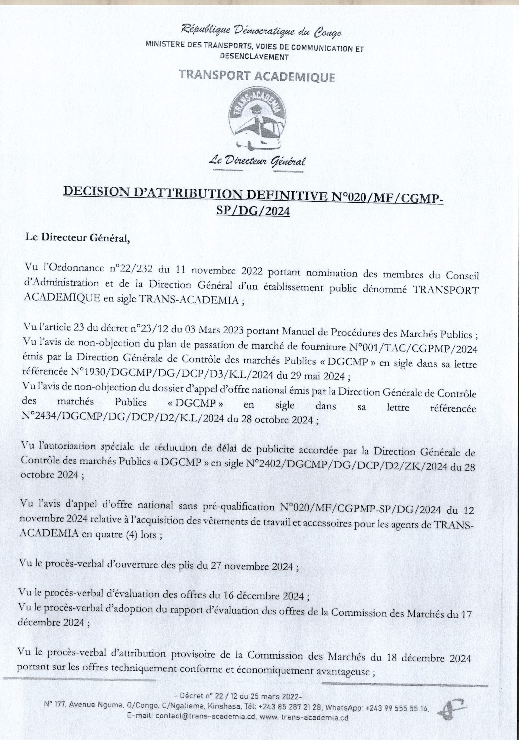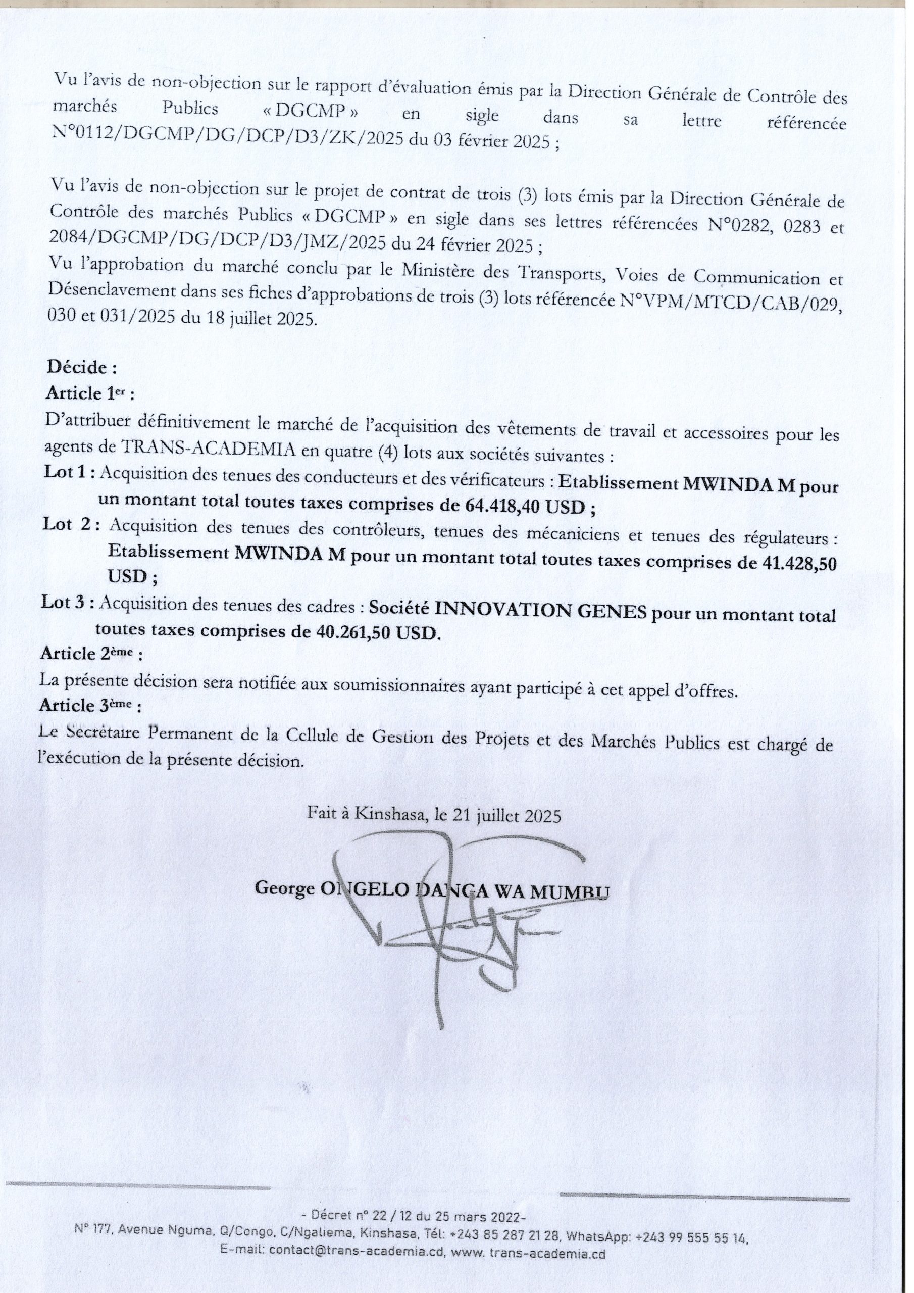 Décision d’attribution définitive du marché relatif à l’acquisition des vetêments de travail et accéssoires pour les agents de Trans-Academia.