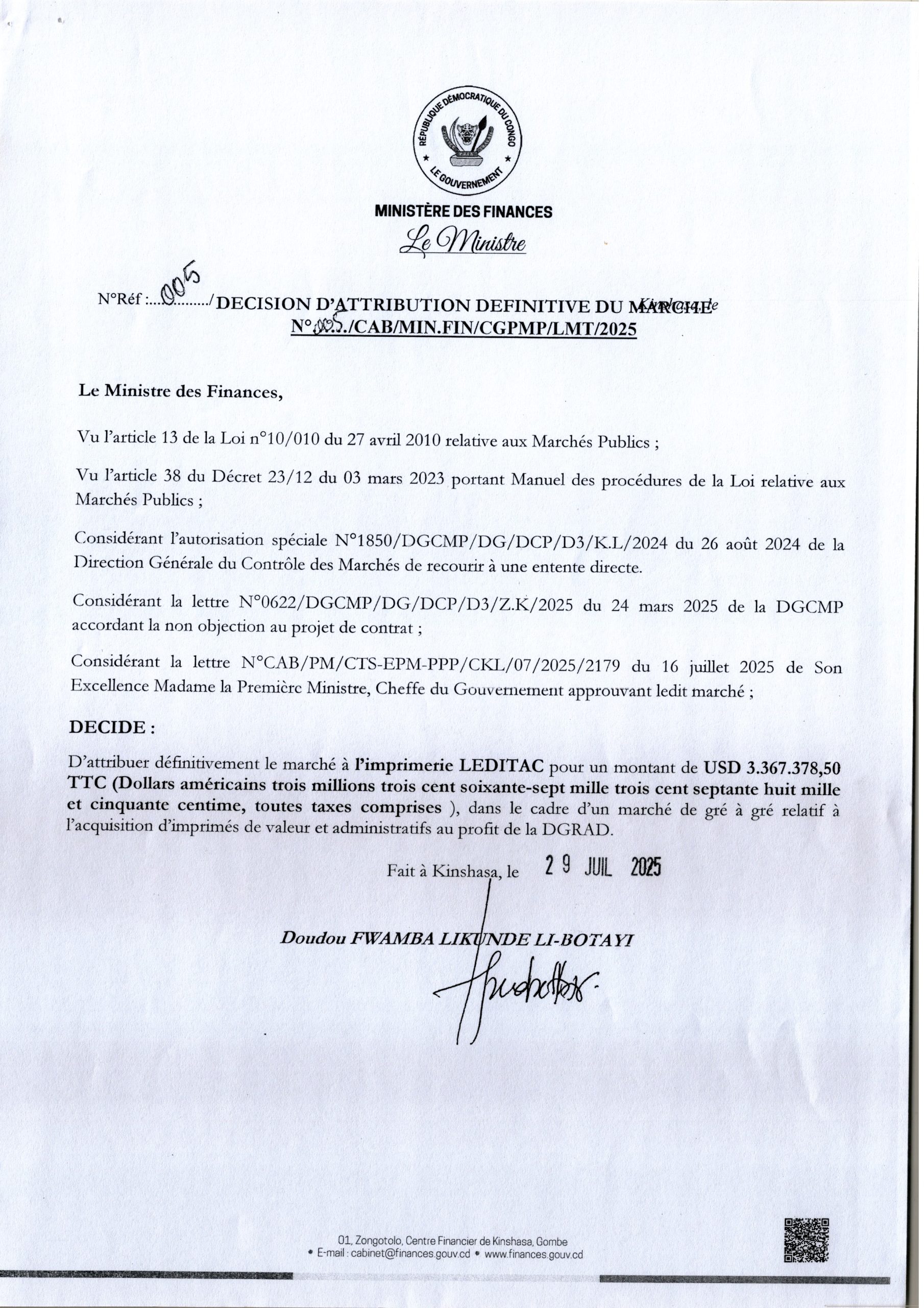 Attribution Définitif du marché de gré à gré relatif à l’acquisition d’imprimés de valeur et administratifs au profit de la DGRAD à l’imprimerie LEDITAC