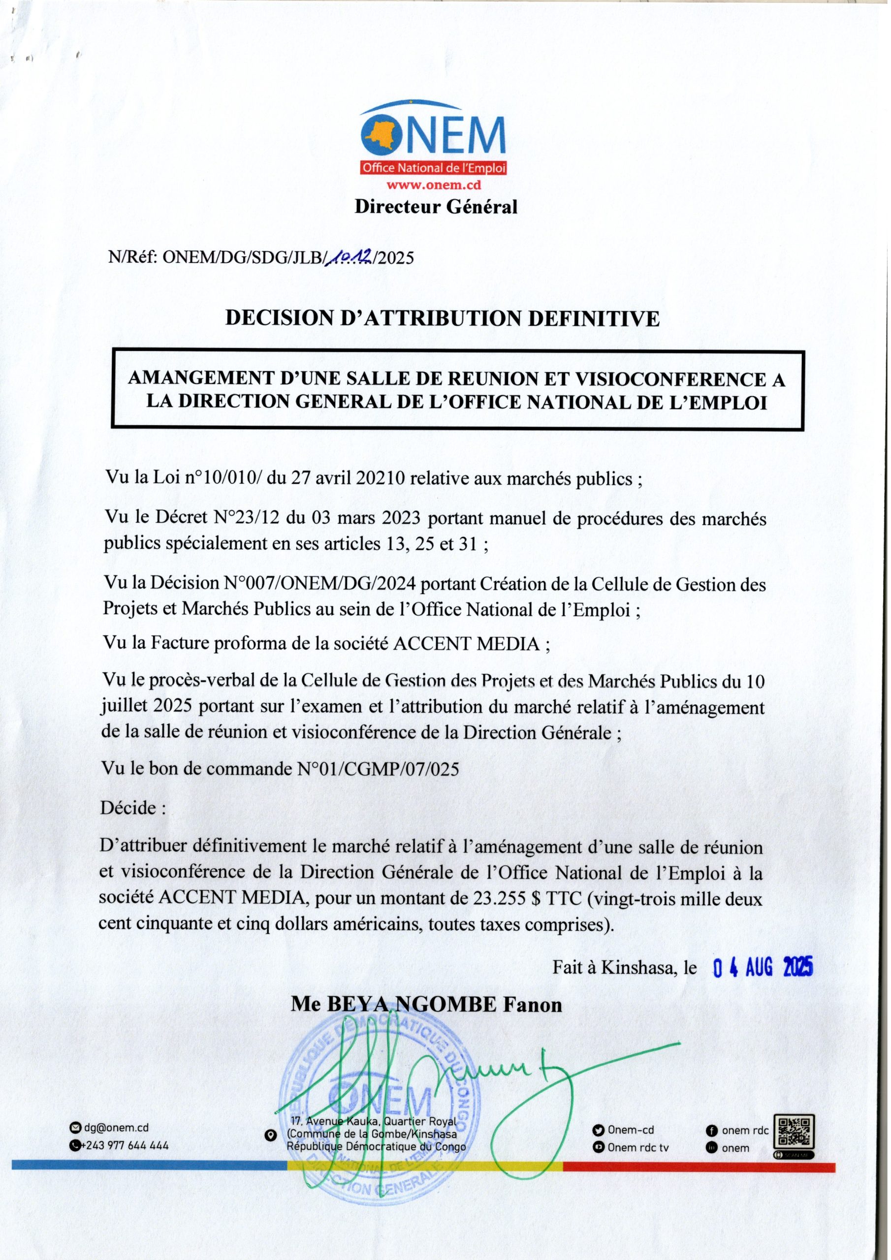 Attribution Définitive d’Aménagement d’une salle de réunion et visioconférence à la Direction Générale de l’Office National de l’Emploi à la société ACCENT MEDIA