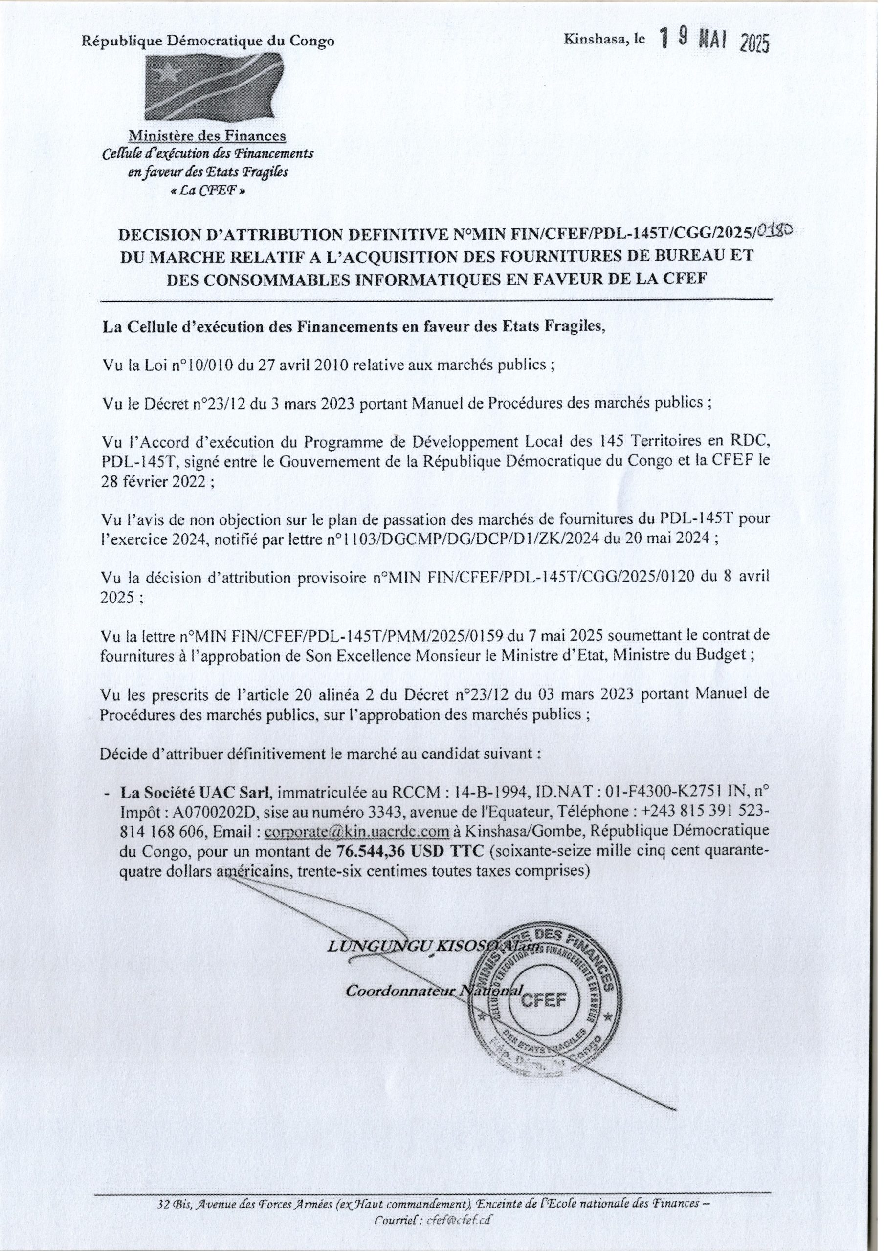 Attribution définitive accordée à la société UAC relative à l’acquisition des fournitures de bureau et des consommables informatiques en faveur de la CFEF