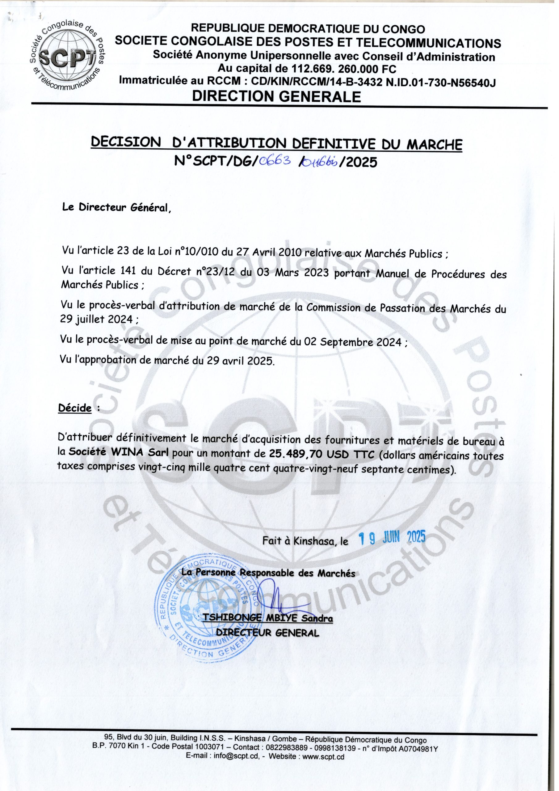 Attribution définitive accordée à la société WINA relative à l’acquisition des fournitures et matériels de bureau