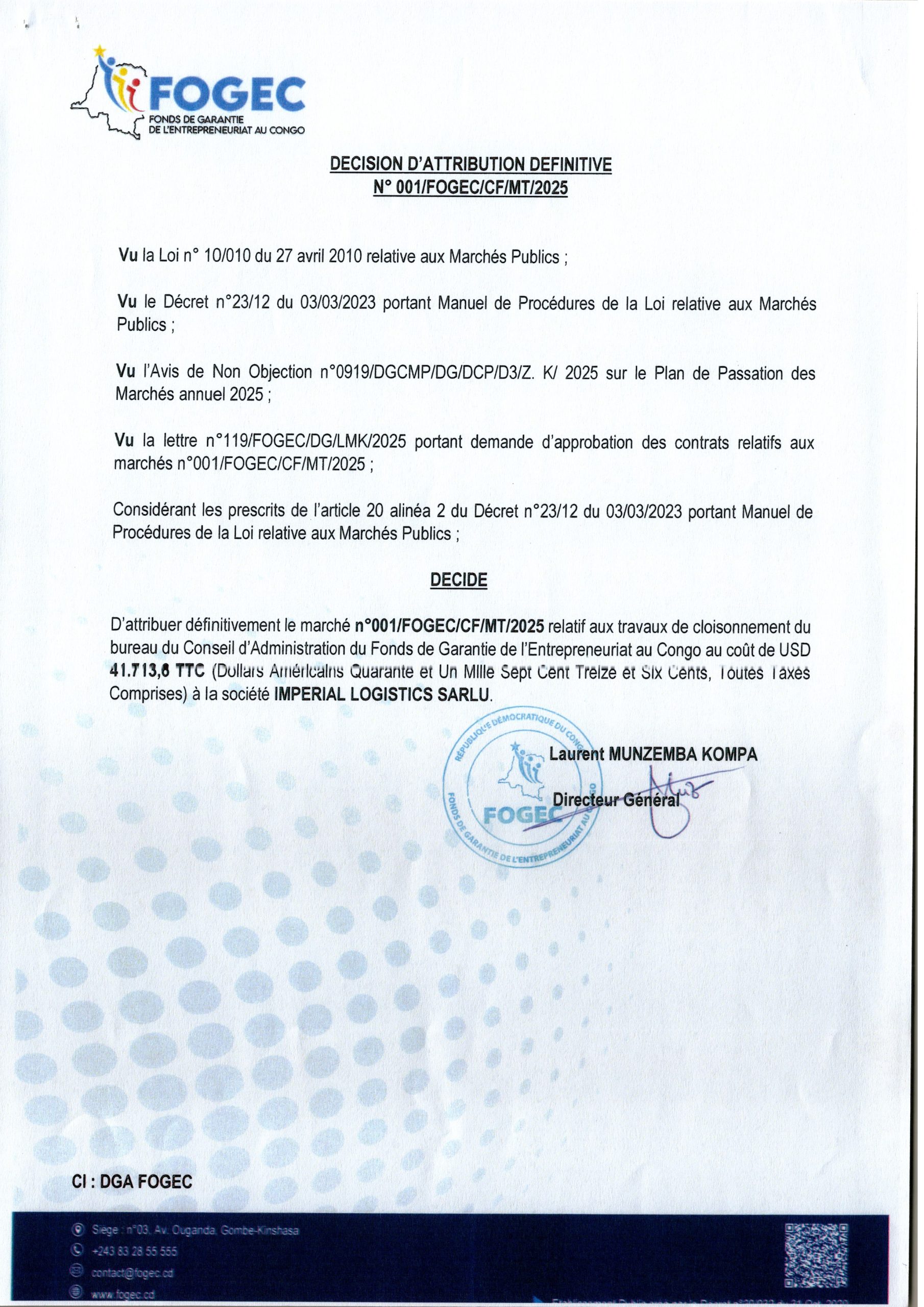 Attribution Définitif du marché des travaux de cloisonnement du bureau du Conseil d’Administration du Fonds de Garantie de l’Entrepreneuriat au Congo à la Société IMPERIAL LOGISTICS SARLU
