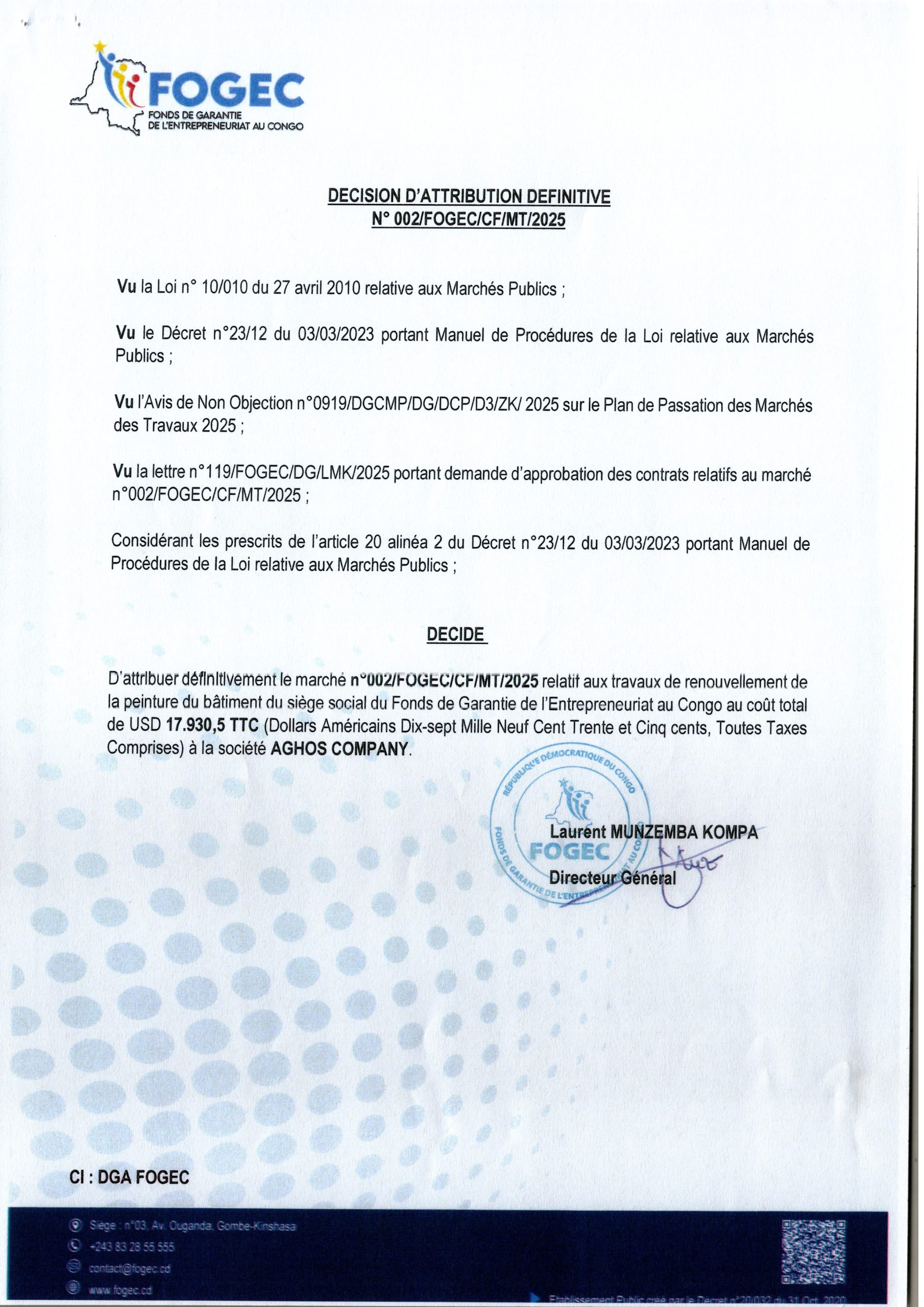 Attribution Définitif du marché des travaux de renouvellement de la peinture du bâtiment du siège social du Fonds de Garantie de l’Entrepreneuriat au Congo à la Société AGHOS COMPANY