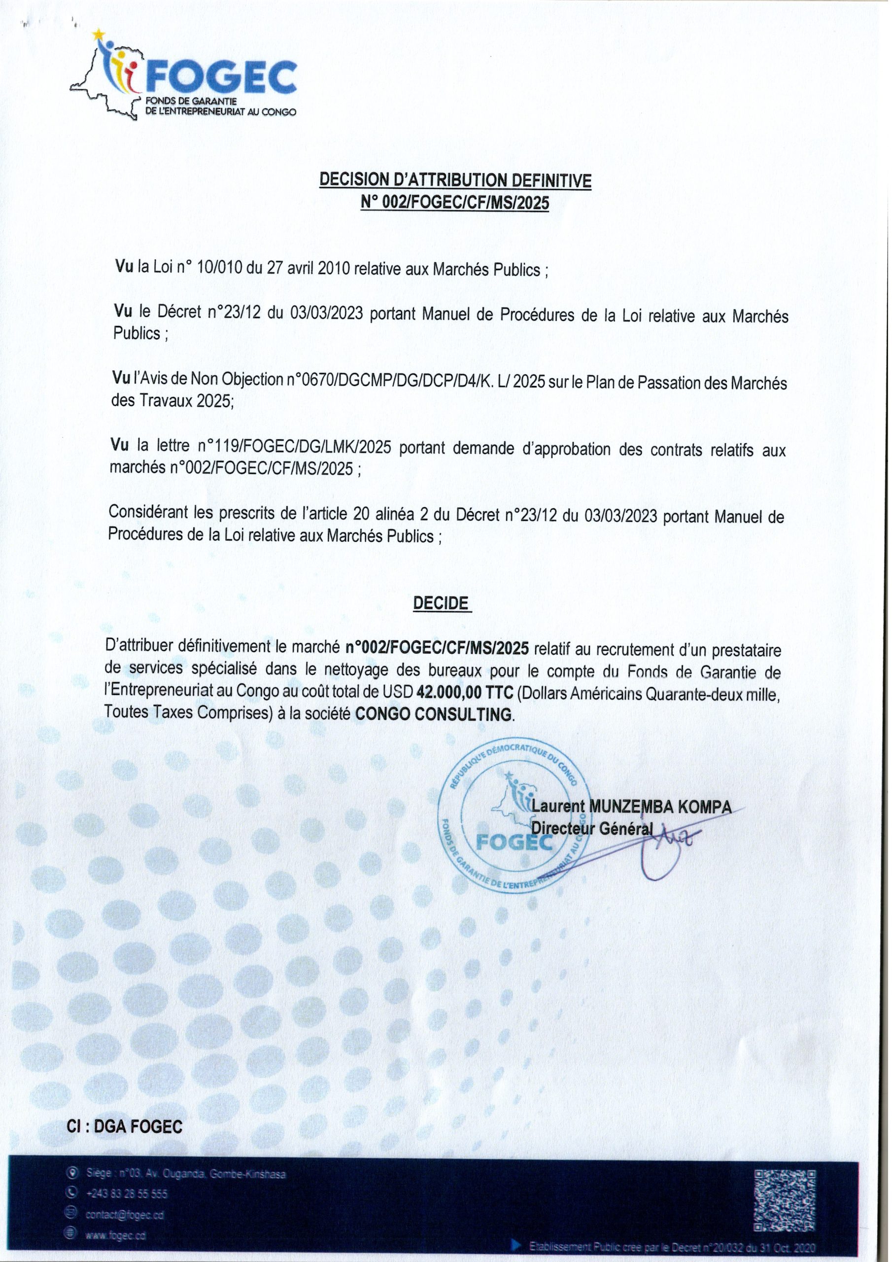Attribution Définitif du marché relatif au recrutement d’un prestataire de services spécialise dans le nettoyage des bureaux pour le compte du Fonds de Garantie de l’Entrepreneuriat au Congo à la Société CONGO CONSULTING