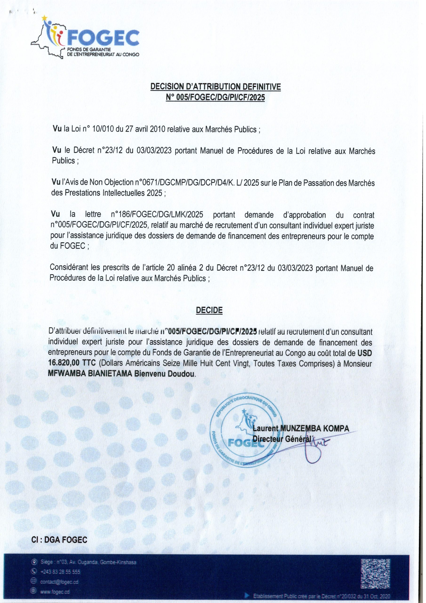 Attribution Définitif du marché relatif au recrutement d’un Consultant individuel expert juriste pour l’assistance juridique des dossiers de demande de financement des entrepreneurs pour le compte du Fonds de Garantie de l’Entrepreneuriat au Congo à Monsieur MFWAMBA BIANIETAMA Bienvenu Doudou