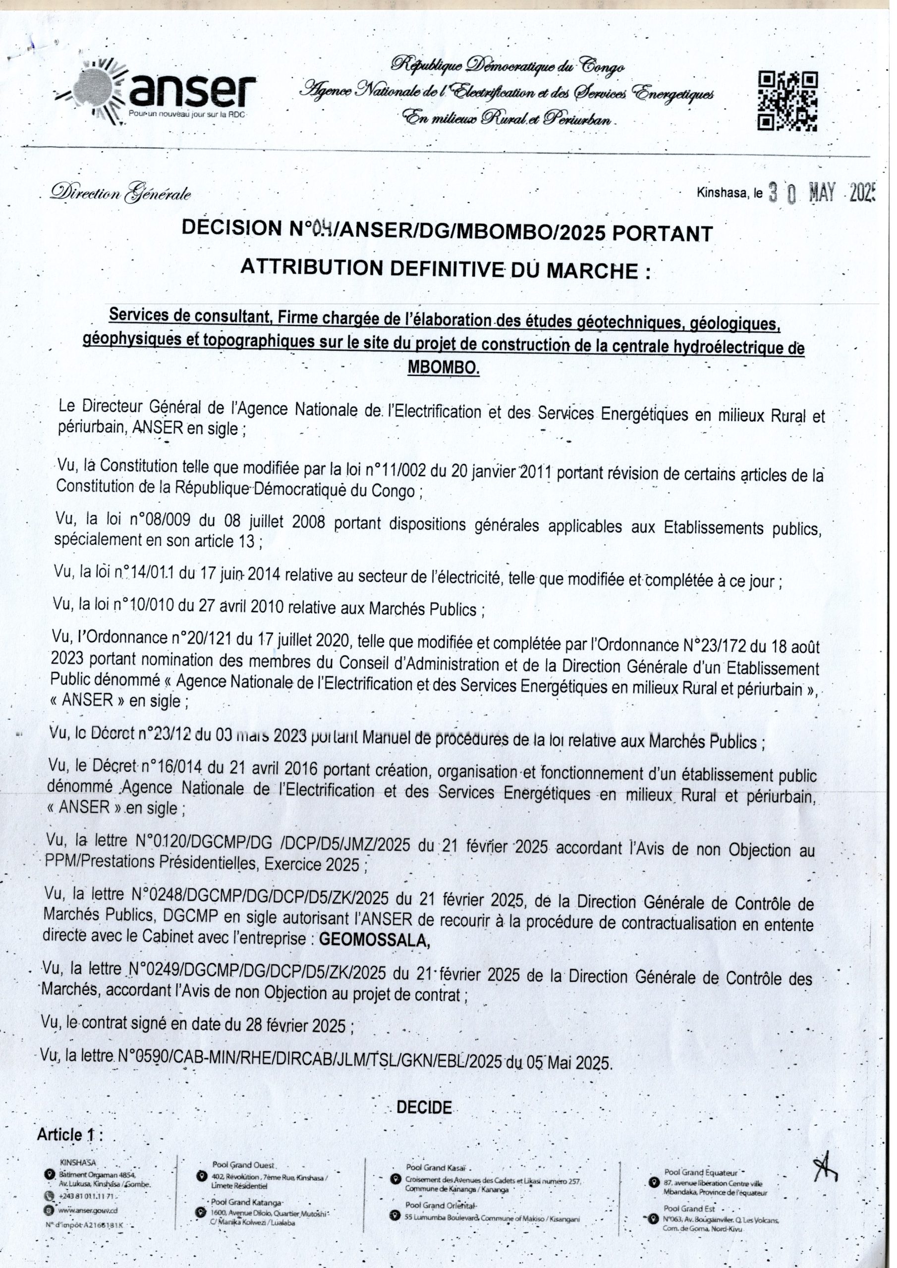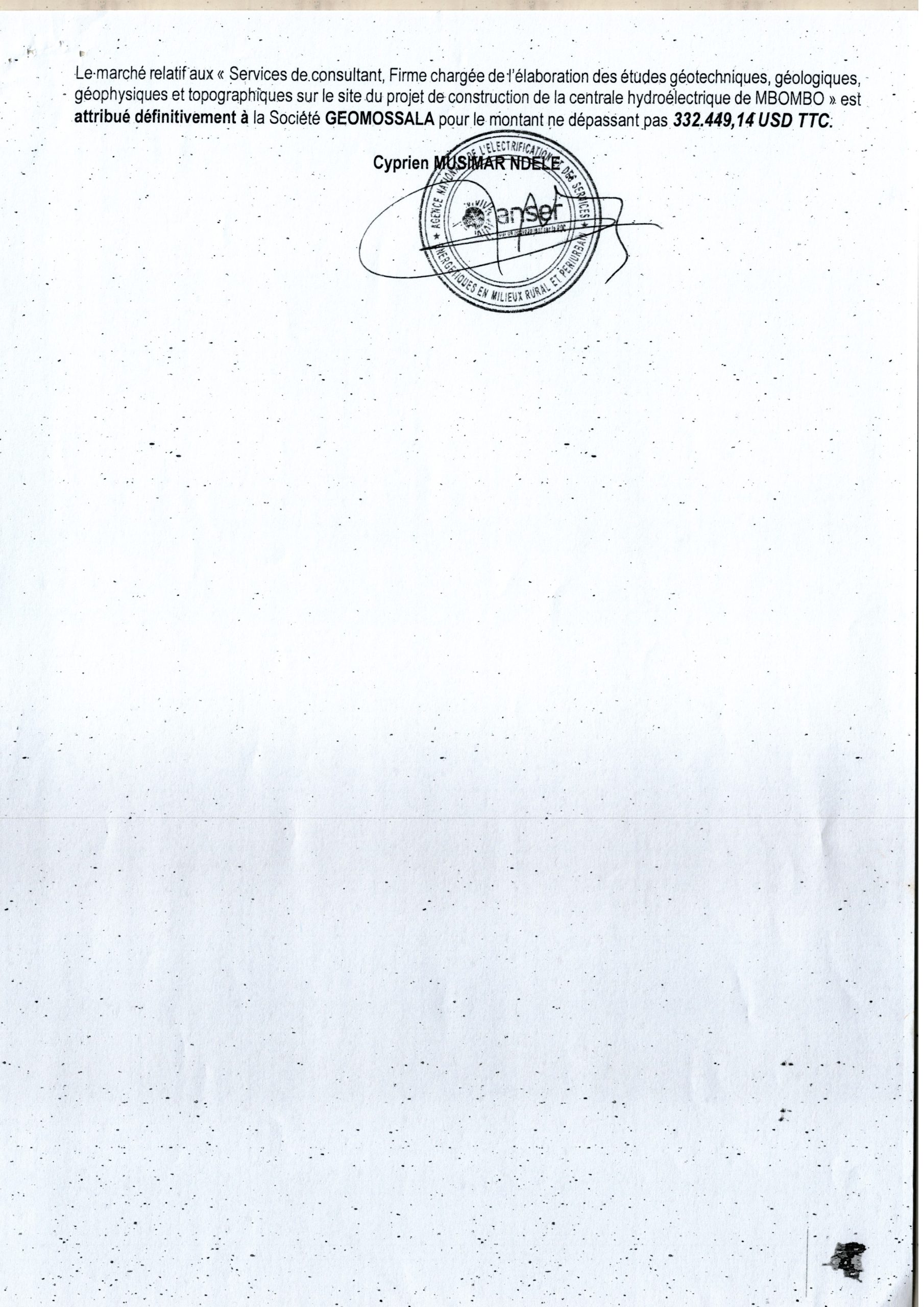 Attribution définitive accordée à l’Entreprise GEOMOSSALA relative au services de consultant, Firme chargée de l’élaboration des l’études géotechniques, géologiques…