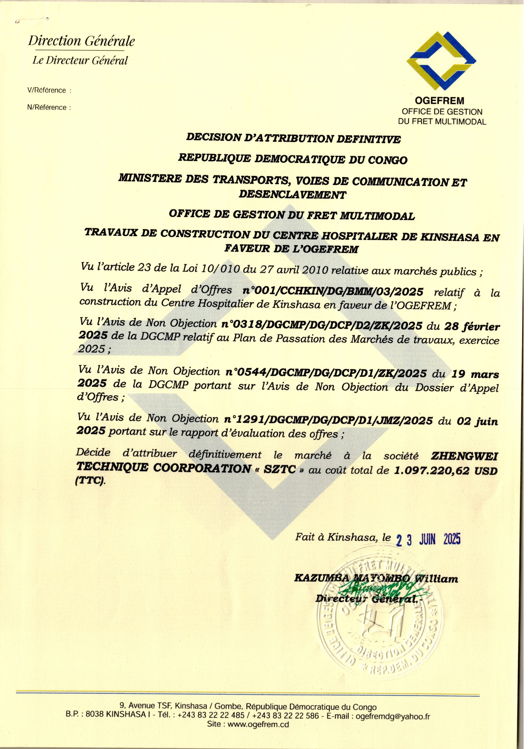 Attribution définitive accordée à la société ZHENGWEI TECHNIQUE COORPORATION “SZTC” relative aux travaux de construction du centre hospitalier de Kinshasa en faveur de l’OGEFREM.