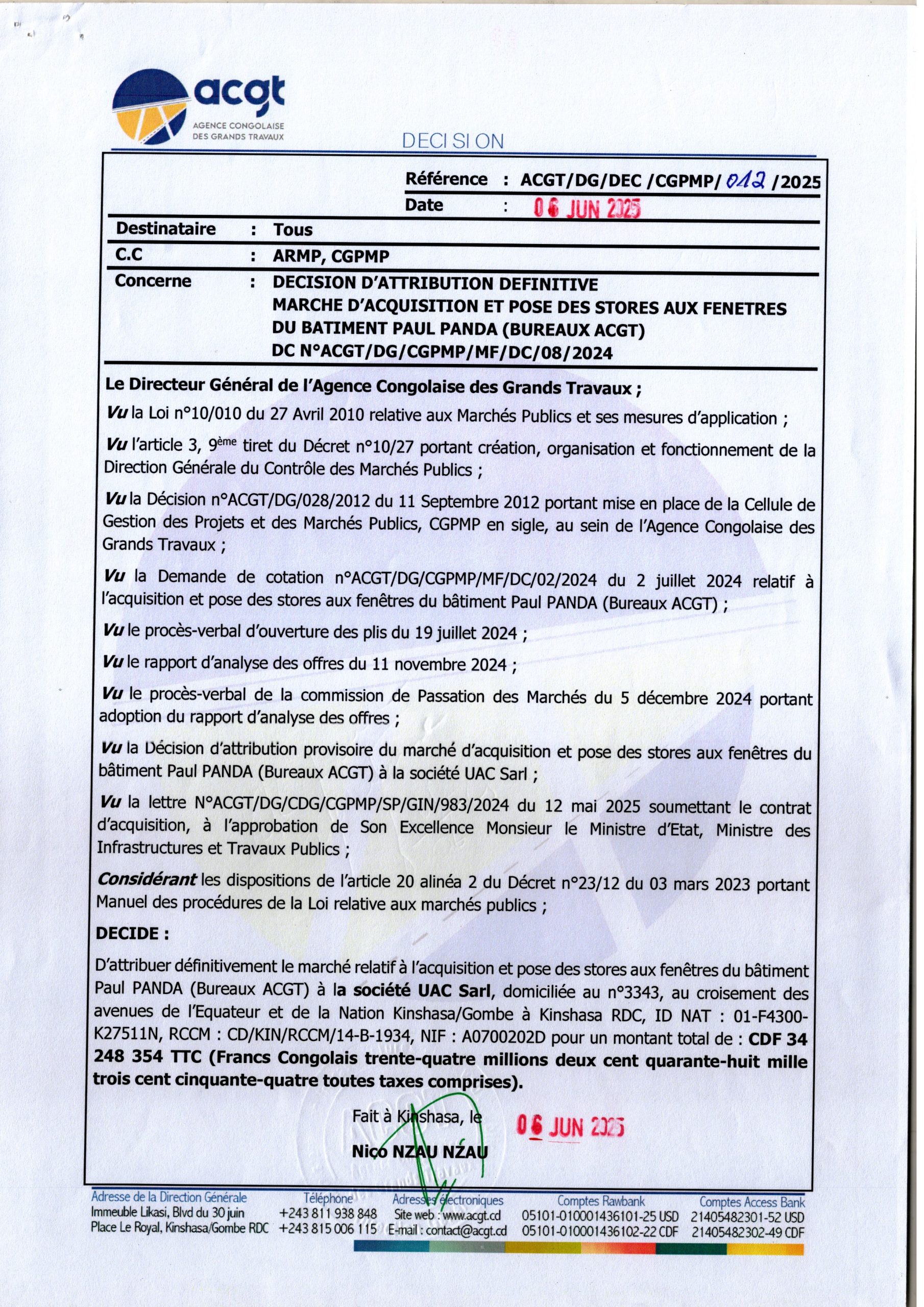 Attribution définitive accordée à la société “UAC Sarl” relative au marché d’acquisition et pose des stores aux fenetres du bâtiment Paul PANDA (Bureaux ACGT)