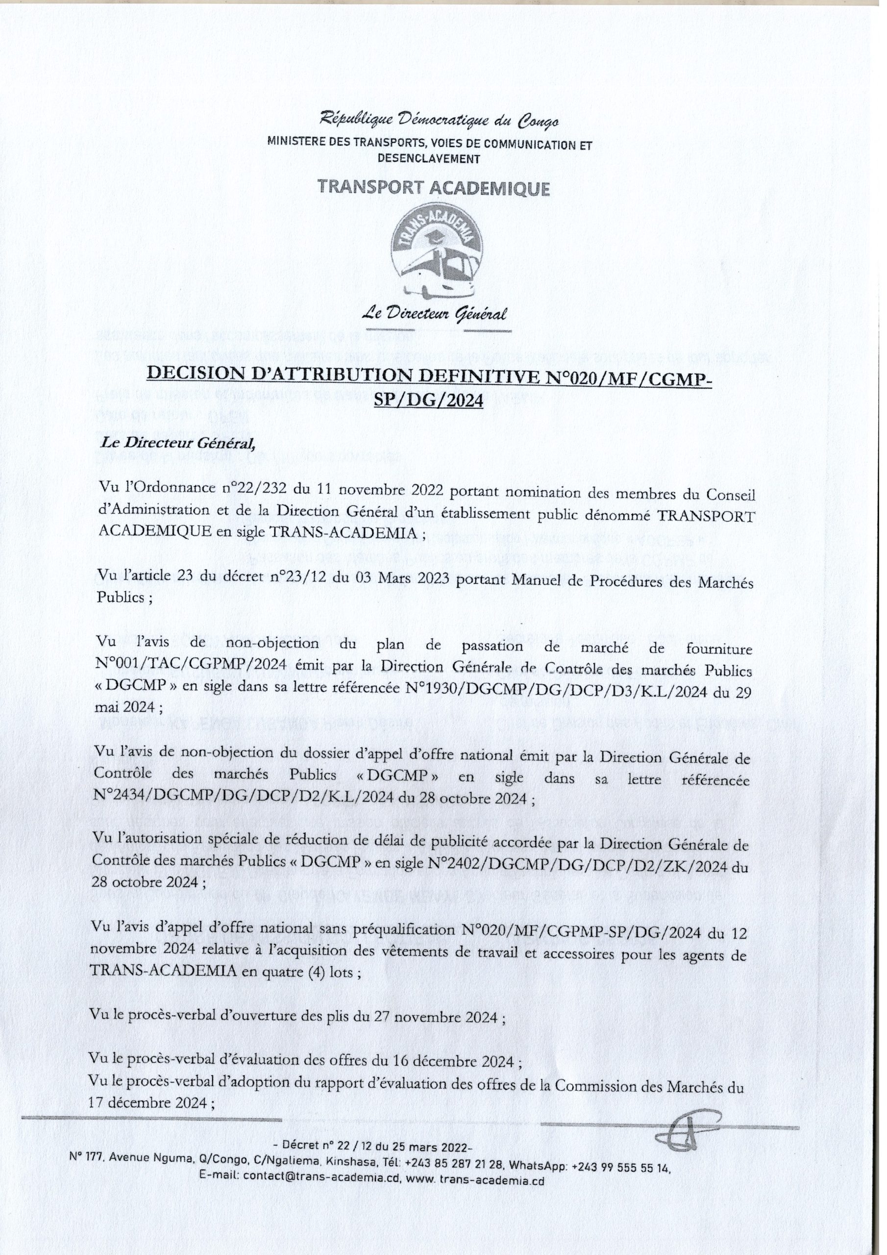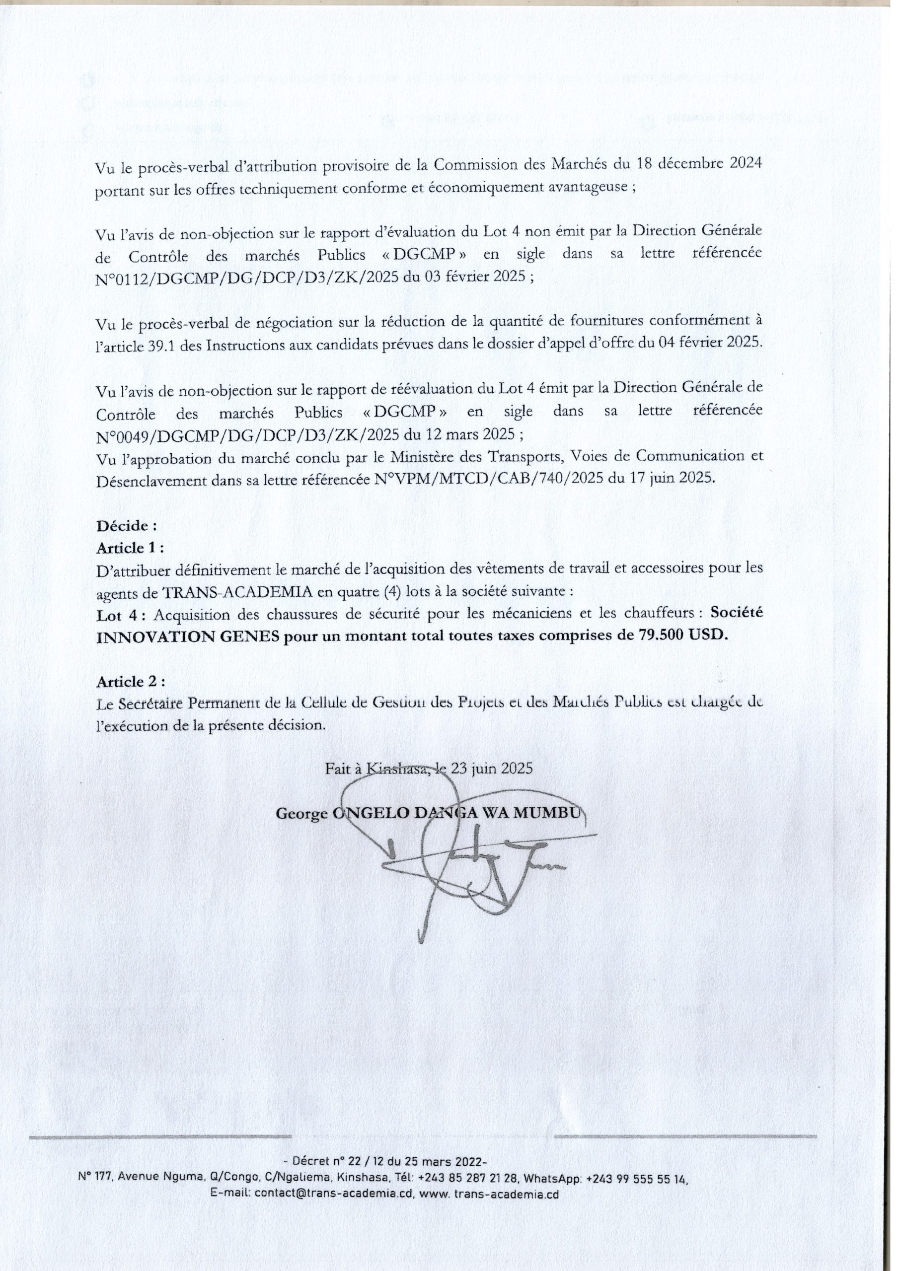 Attribution définitive accordée à la société “INNOVATION GENES” relatif au marché d’acquisition des chaussures de sécurité pour les mécaniciens et les chauffeurs.