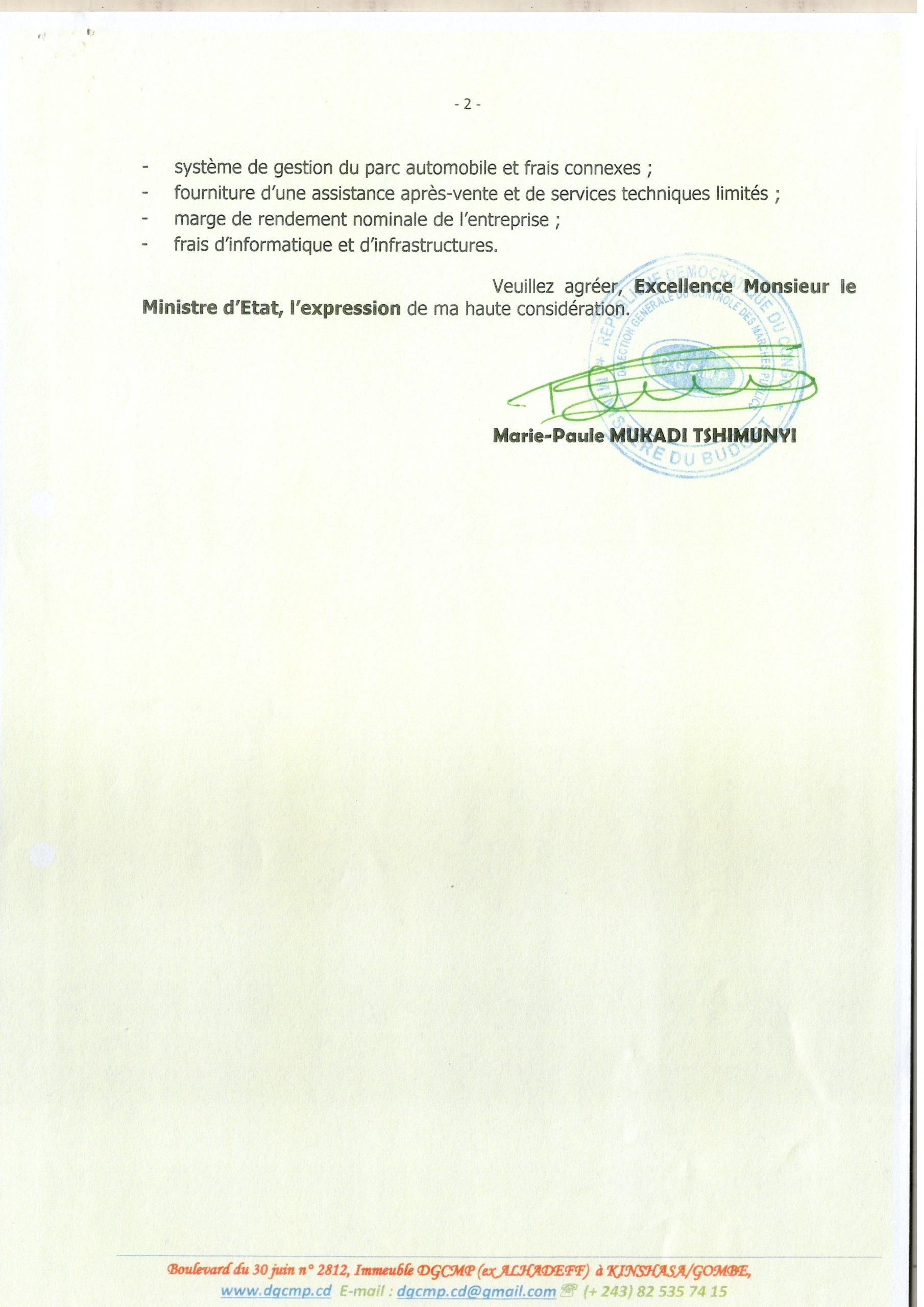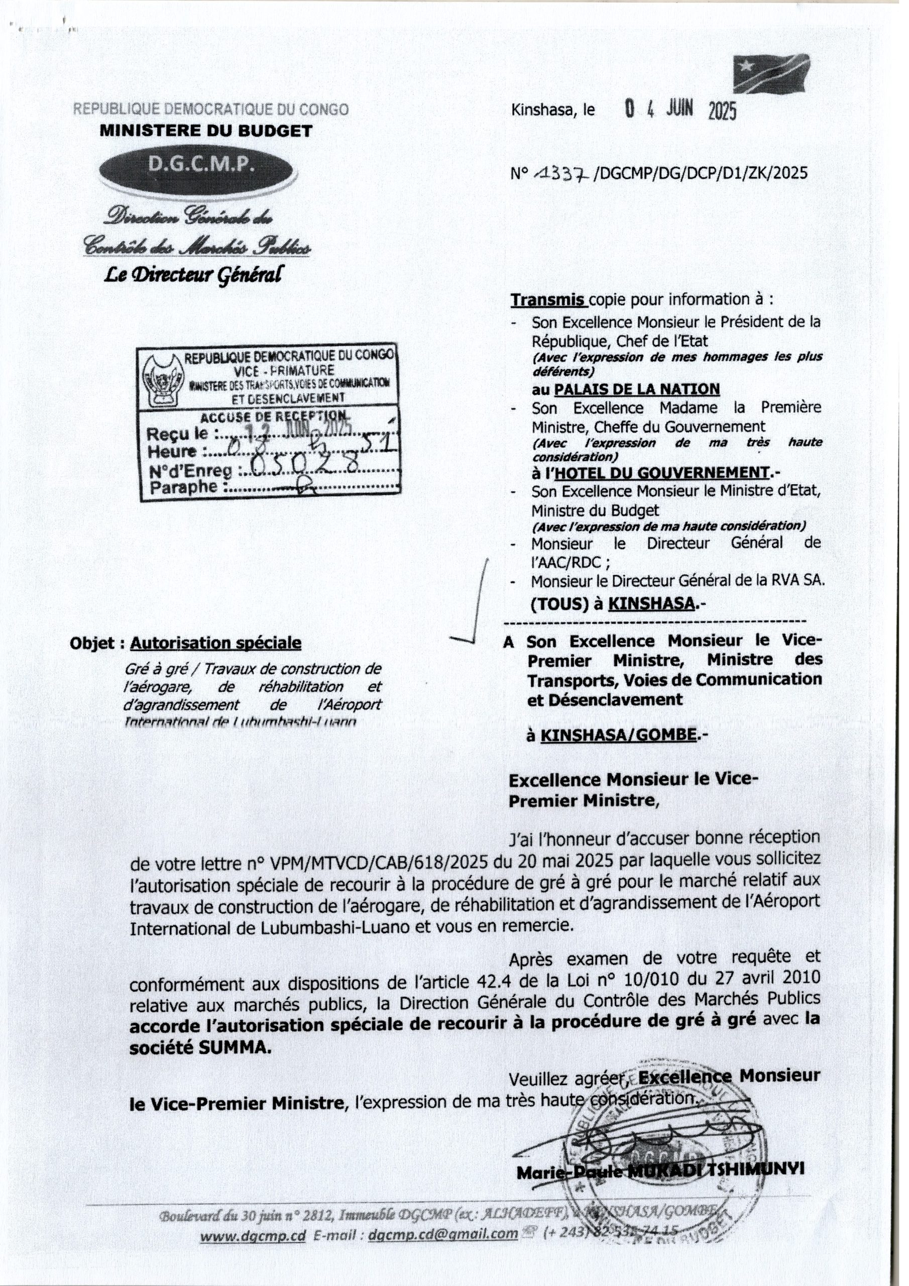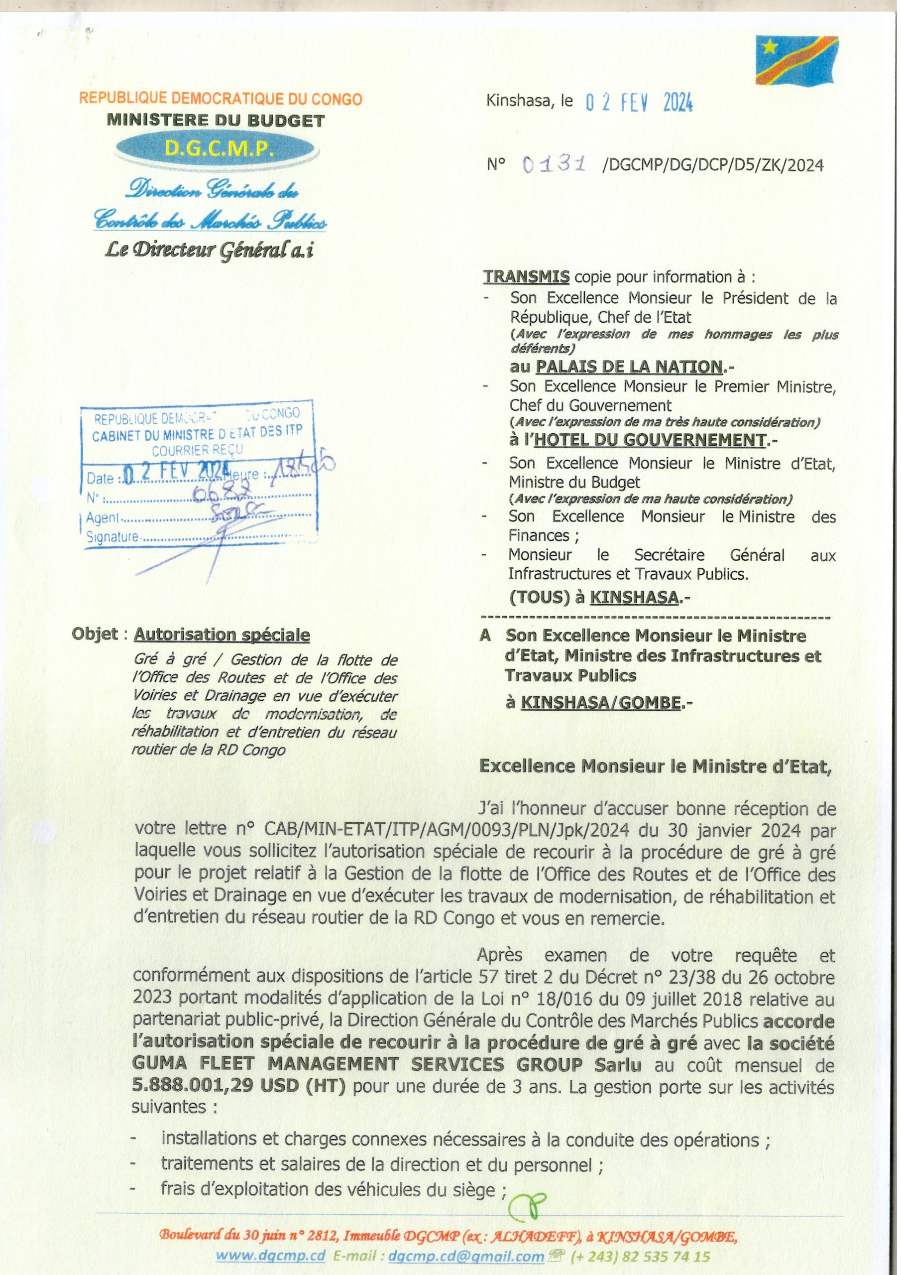Autorisation Spéciale de recourir au Gré à Gré pour le projet relatif à la Gestion de la flotte de l’Office des Routes et de l’Office des Voiries et Drainage en vue d’exécuter les travaux de modernisation, de réhabilitation et d’entretien du réseau routier de la RD Congo avec la société GUMA FLEET MANAGEMENT SERVICES GROUP Sarlu.