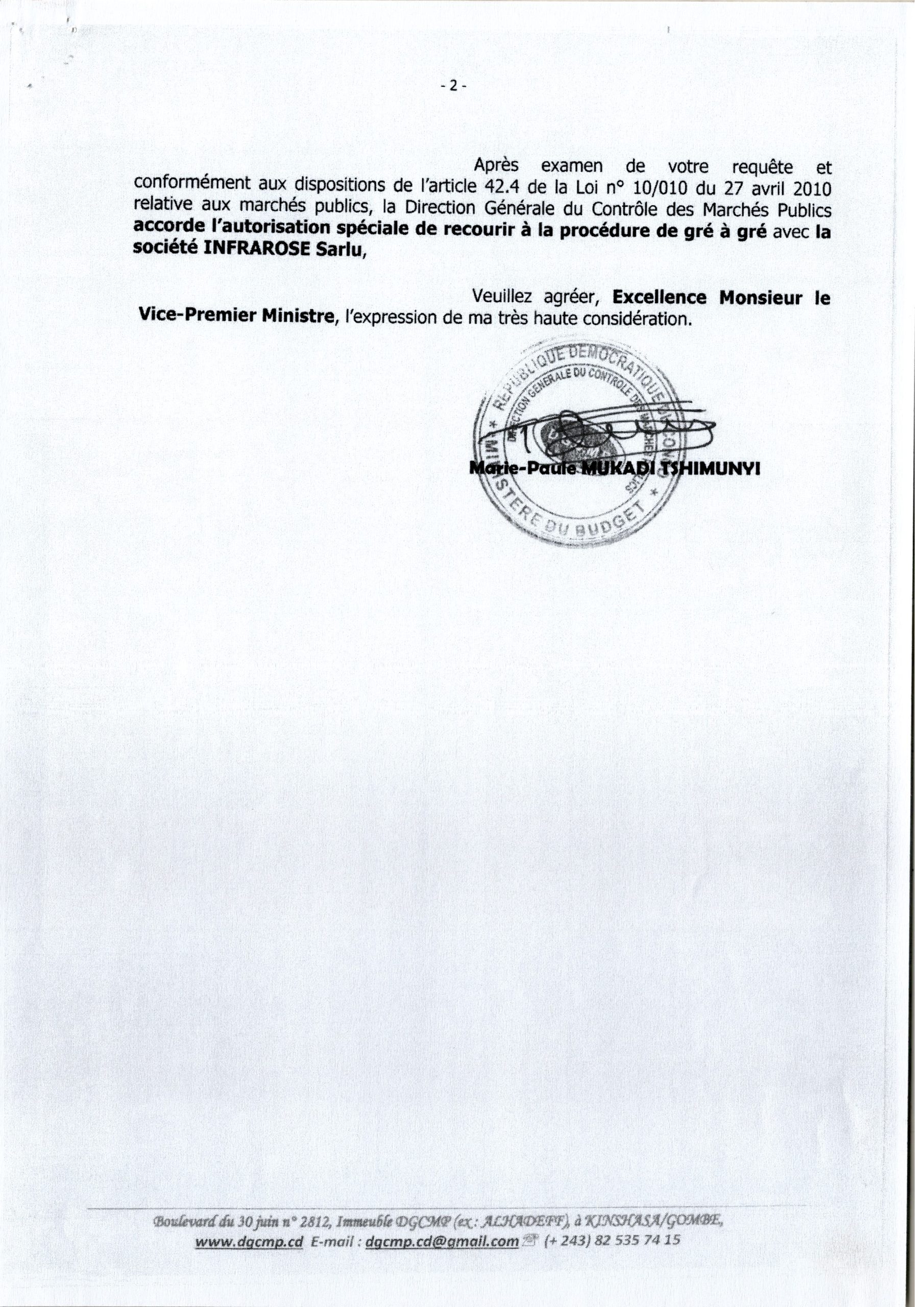 Autorisation spéciale pour le recours au mode gré à gré pour le marché relatif aux travaux de montage des containers en bureaux pour abriter les locaux du Conseil Supérieur de la Police Nationale Congolaise