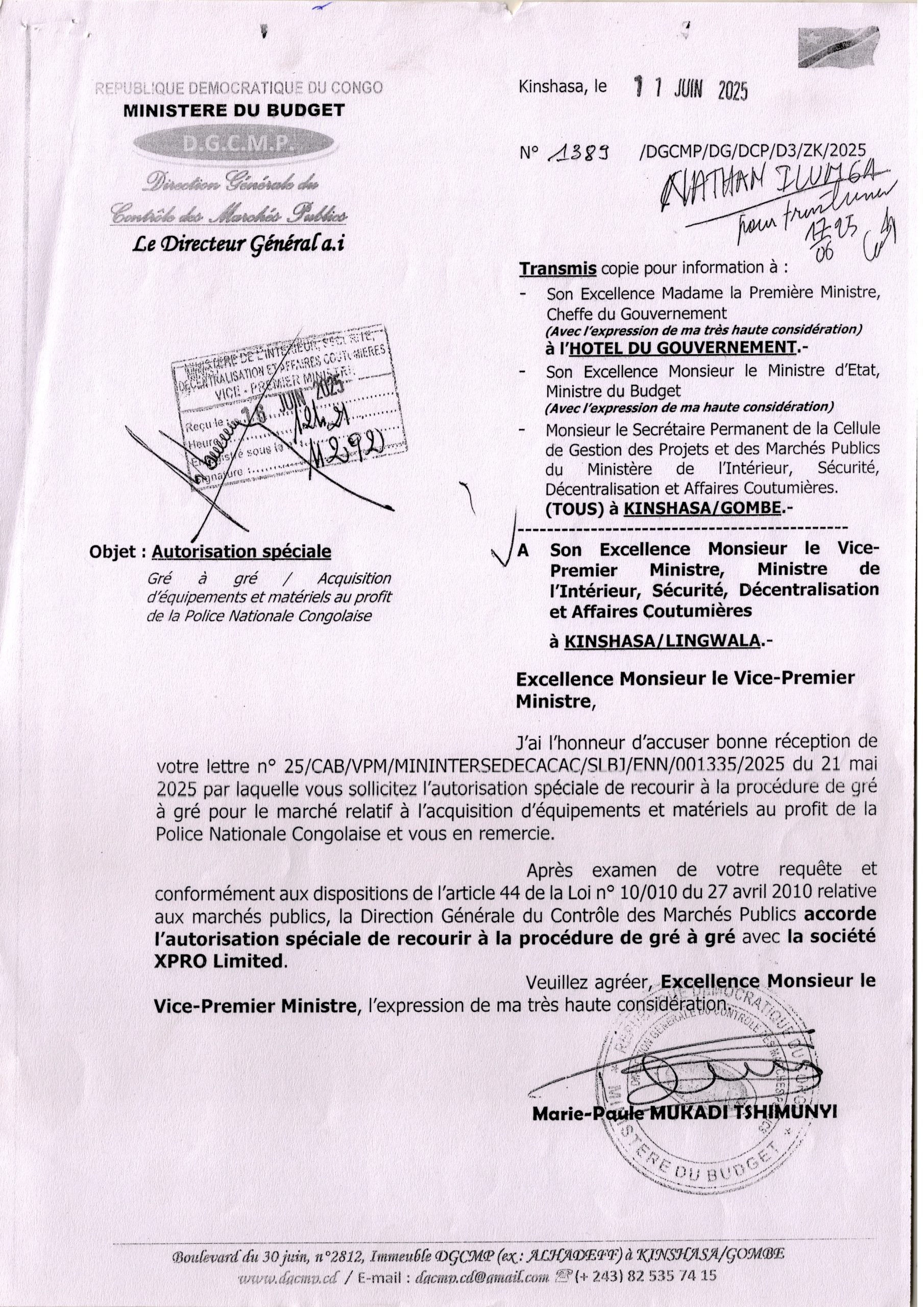Autorisation Spéciale Gré à gré / Acquisition d’équipements et matériels au profit de la Police Nationale Congolaise.