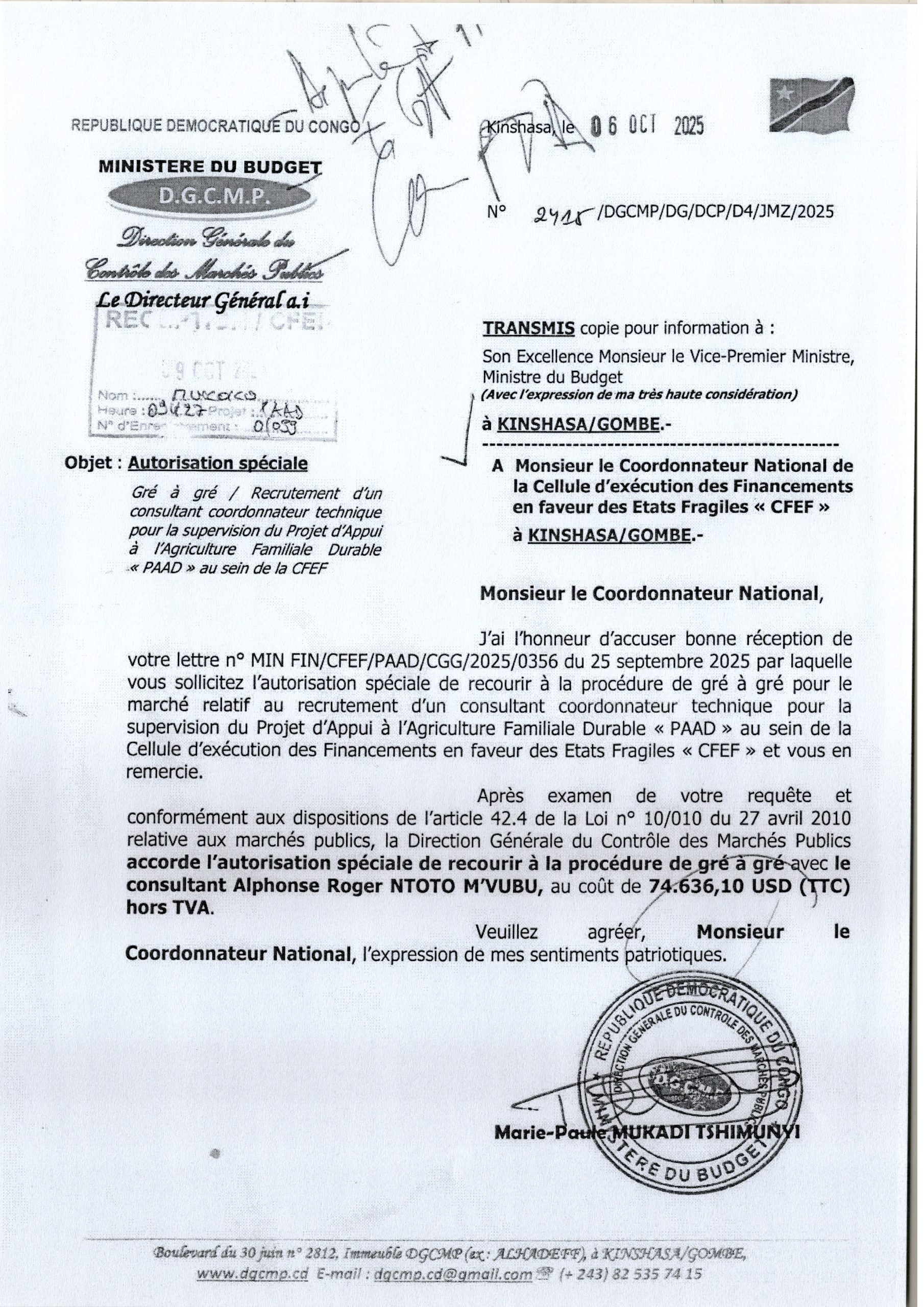 Autorisation Spéciale Gré à Gré / Recrutement d’un consultant coordonnateur technique pour la supervision du Projet d’Appui à l’Agriculture Familiale Durable “PAAD ” au sein de la CFEF