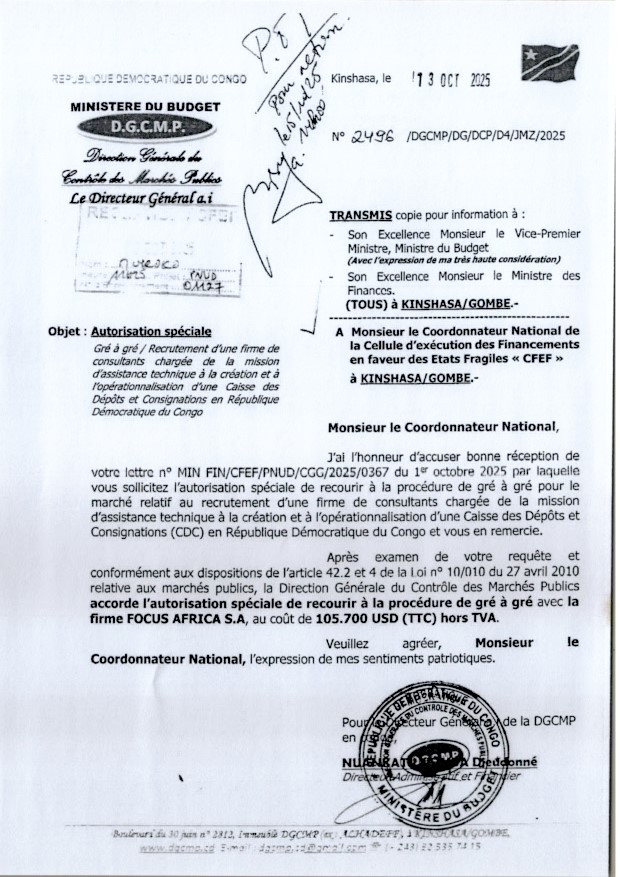 Autorisation spéciale Gré à Gré / Recrutement d’une firme de consultants chargée de la mission d’assistance technique à la création et à l’opérationnalisation d’une Caisse des Dépôts et Consignations en République Démocratique du Congo