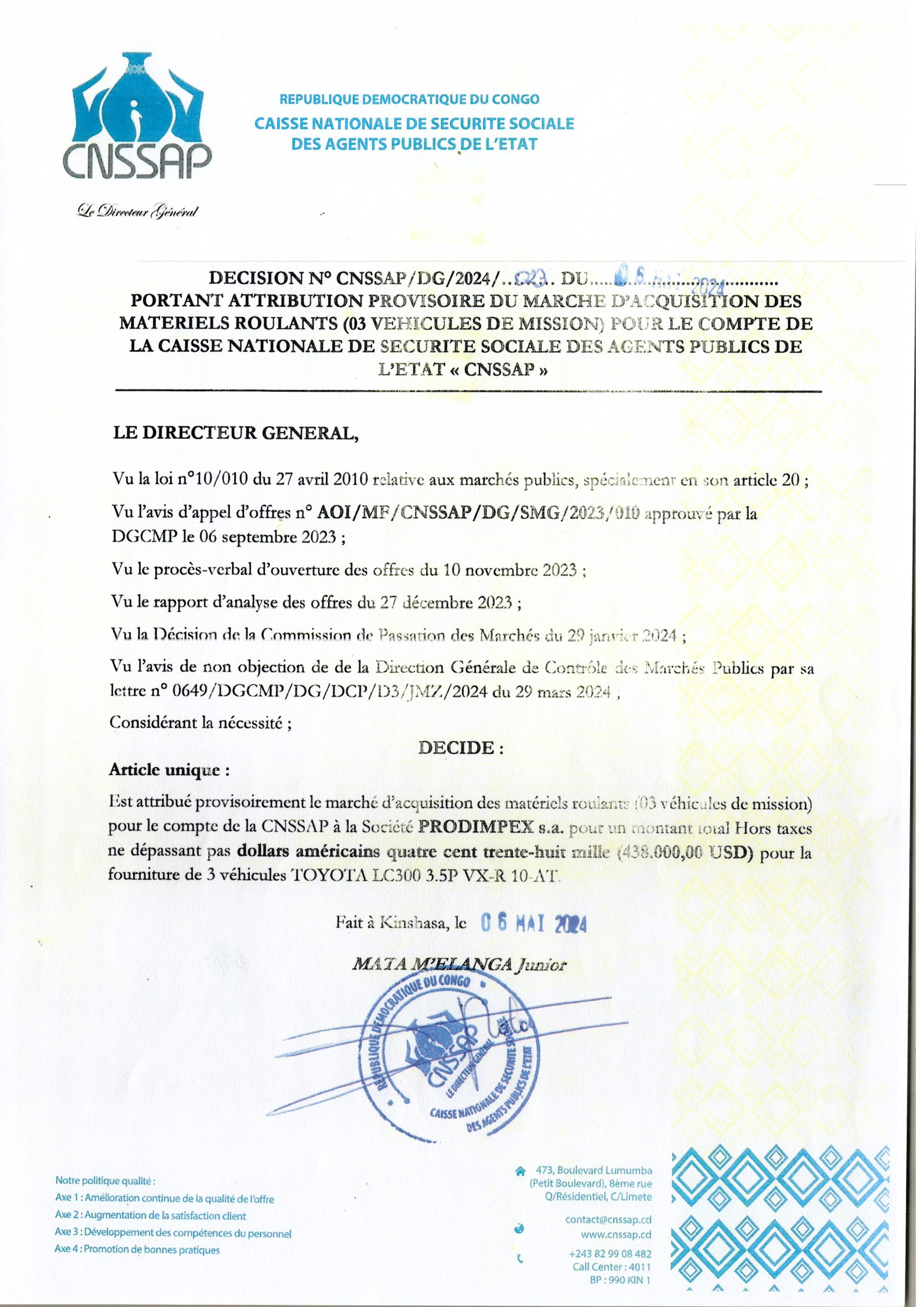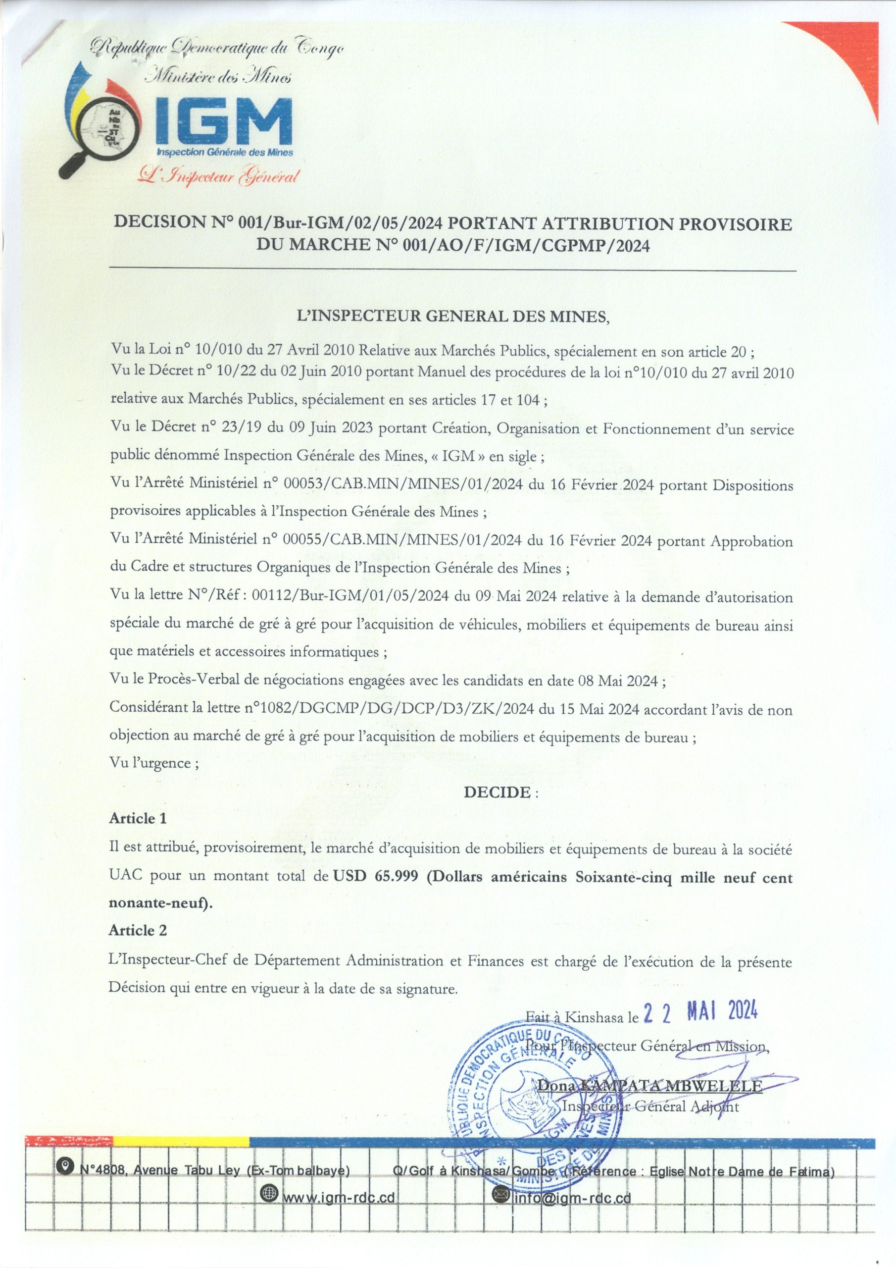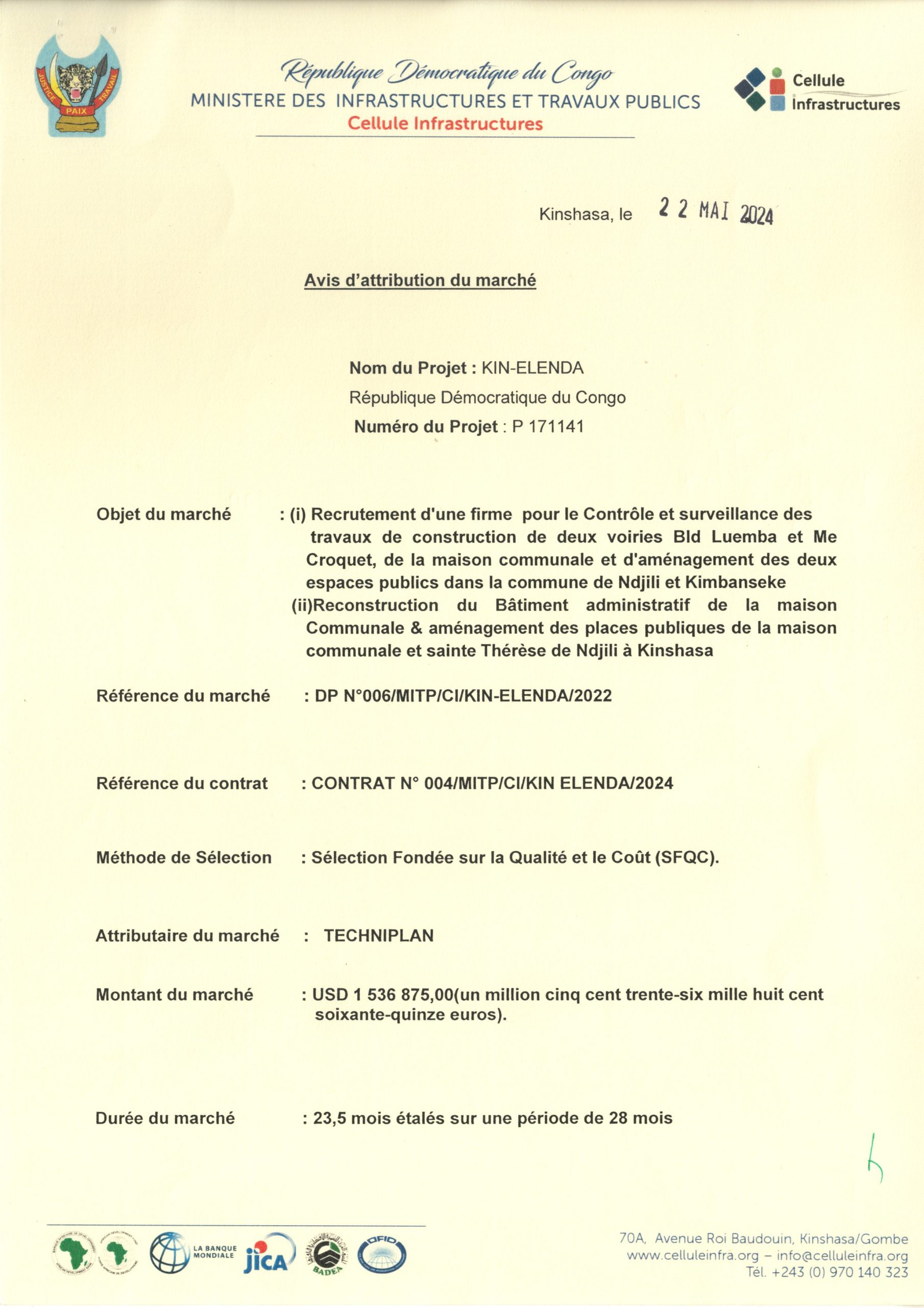 Attribution provisoire du BCECO accordée à Monsieur MUKOKA KAZADI Jonathan relative aux services d’un consultant (Individu) devant réaliser les études architecturales des travaux des travaux de construction d’un centre sportif dans le quartier Kemi dans la Commune de Lemba à Kinshasa.
