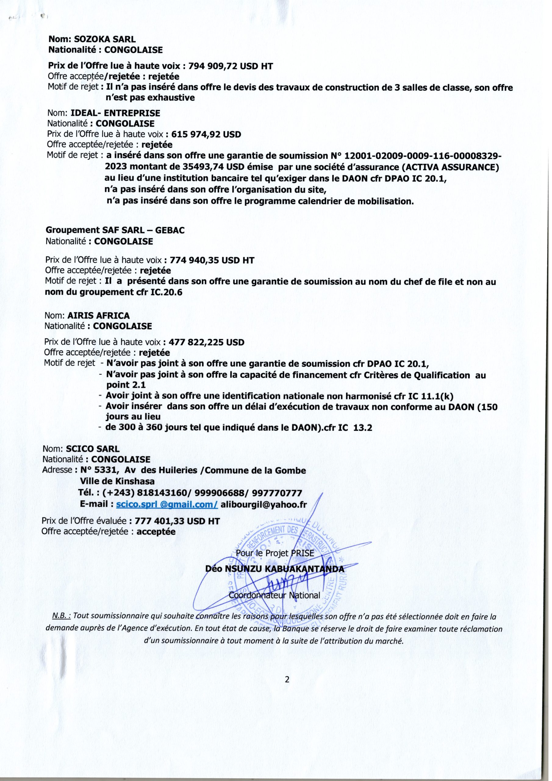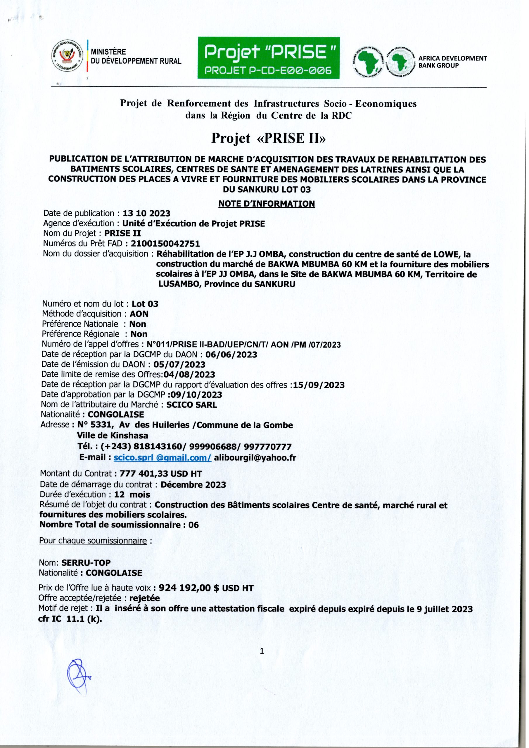 ATTRIBUTION DE MARCHE ACCORDÉE À SCICO SARL RELATIVE À LA RÉHABILITATION DE L’EP J.J OMBA, CONSTRUCTION DU SANTÉ DE LOWE, LA CONSTRUCTION DU MARCHÉ DE BAKWA MBUMBA 60 KM ET LA FOURNITURE DES MOBILIERS SCOLAIRES À L’EP J.J OMBA, DANS LE SITE DE BAKWA…