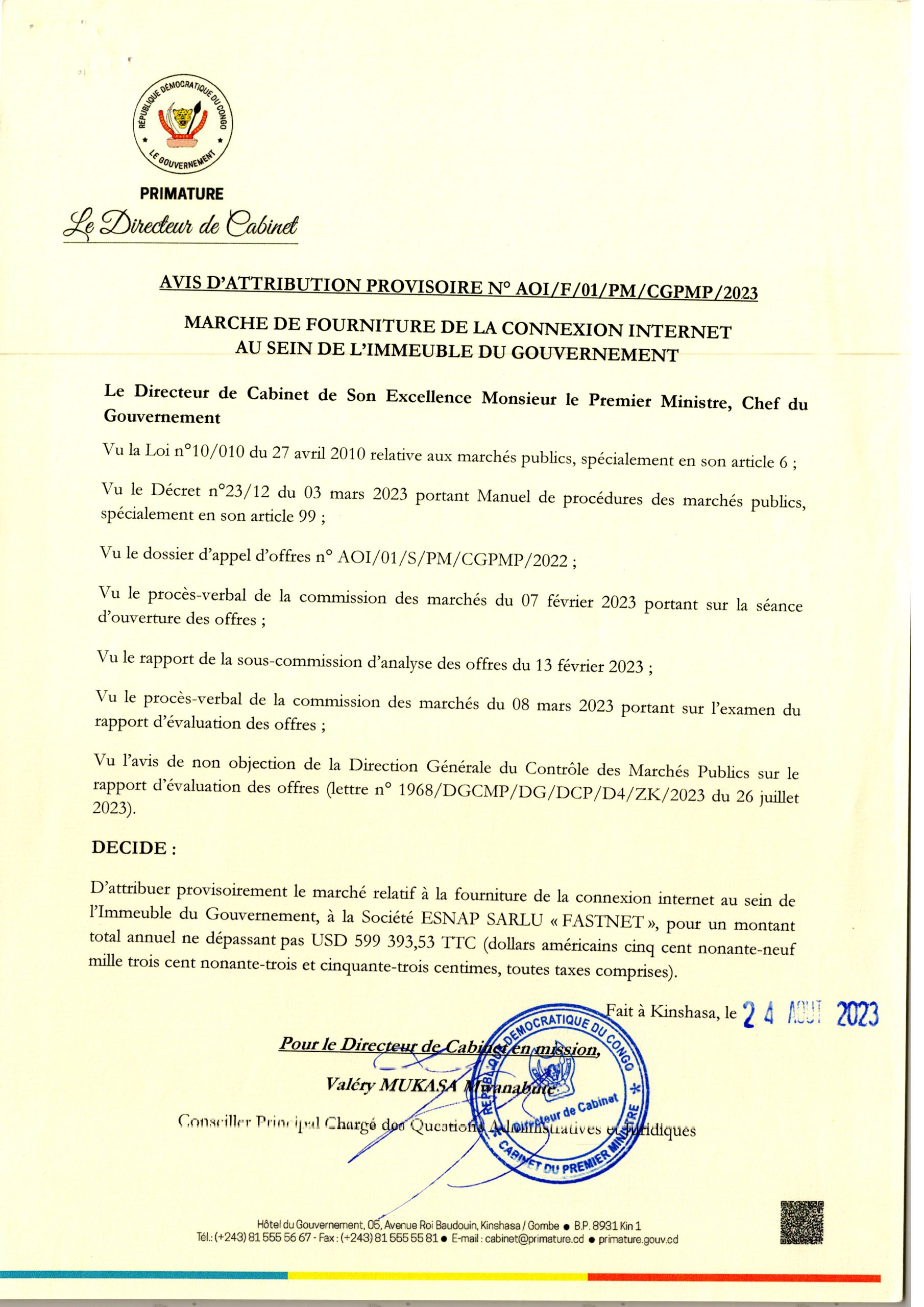 Attribution provisoire de la Primature accordée à la société ESNAP SARLU ” FASTNET” relative à la fourniture de la connexion Internet au sein de l’Immeuble du gouvernement