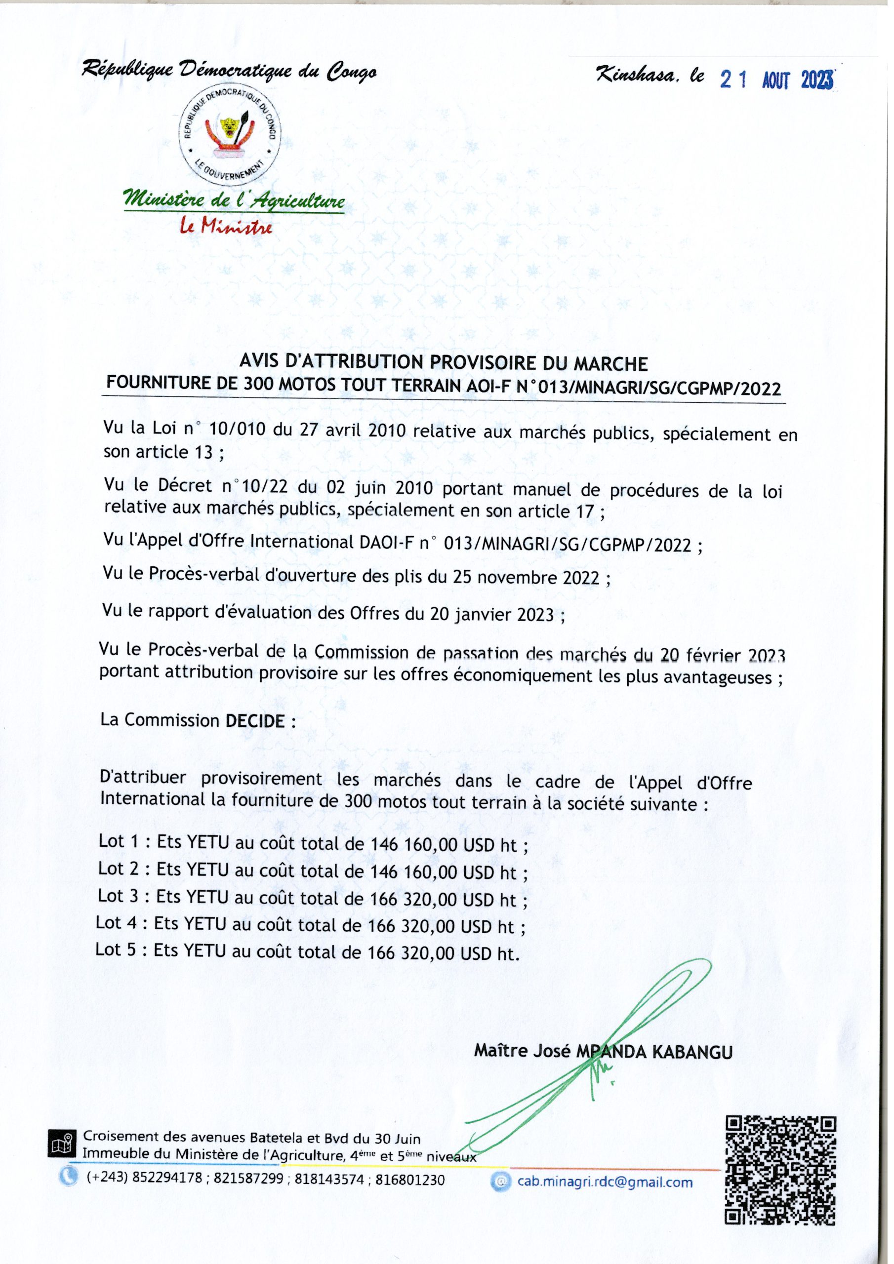 Attribution provisoire accordée à la société SADA MOTORS RDC relative à l’acquisition des Véhicules Terrestres au profit du Conseil Supérieur du Portefeuille (lot 2 et lot 3)