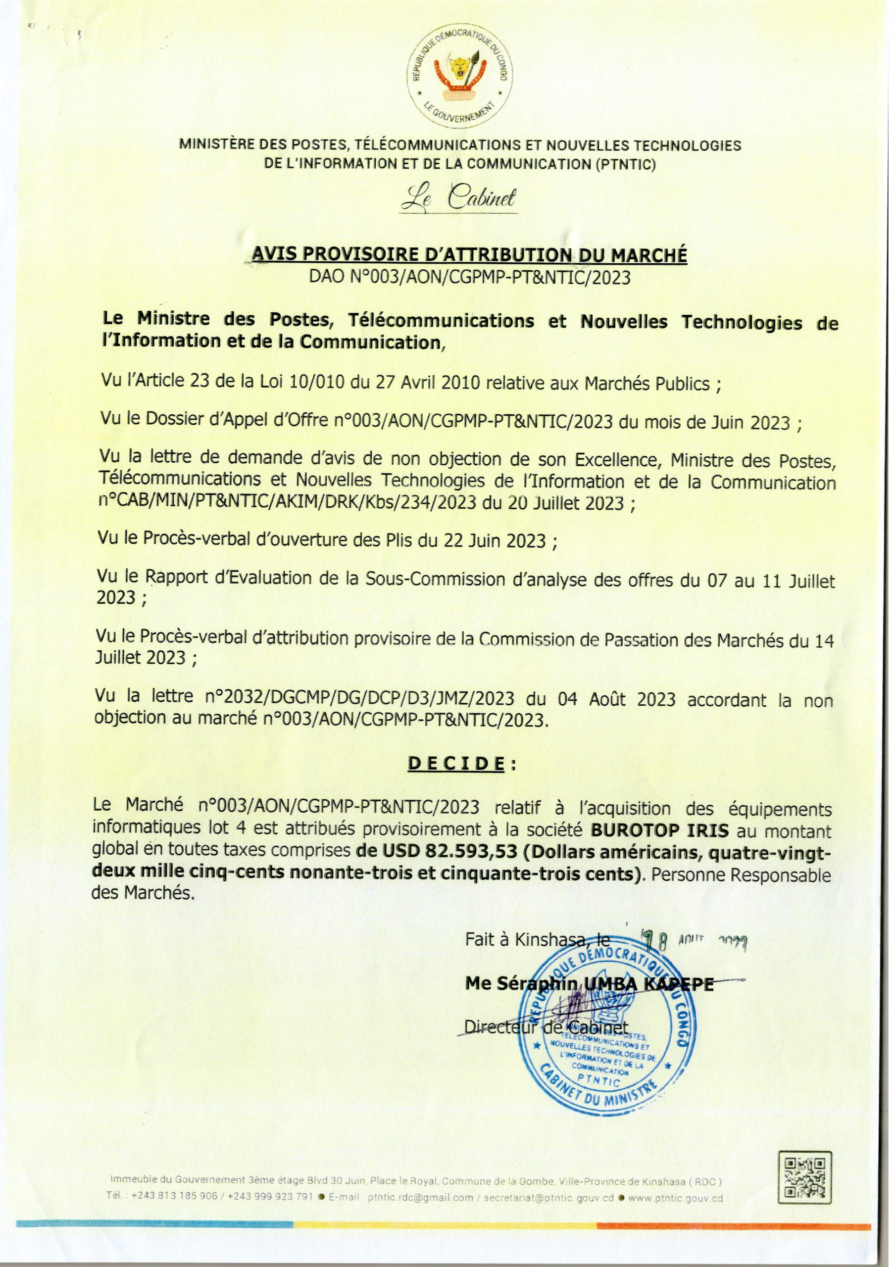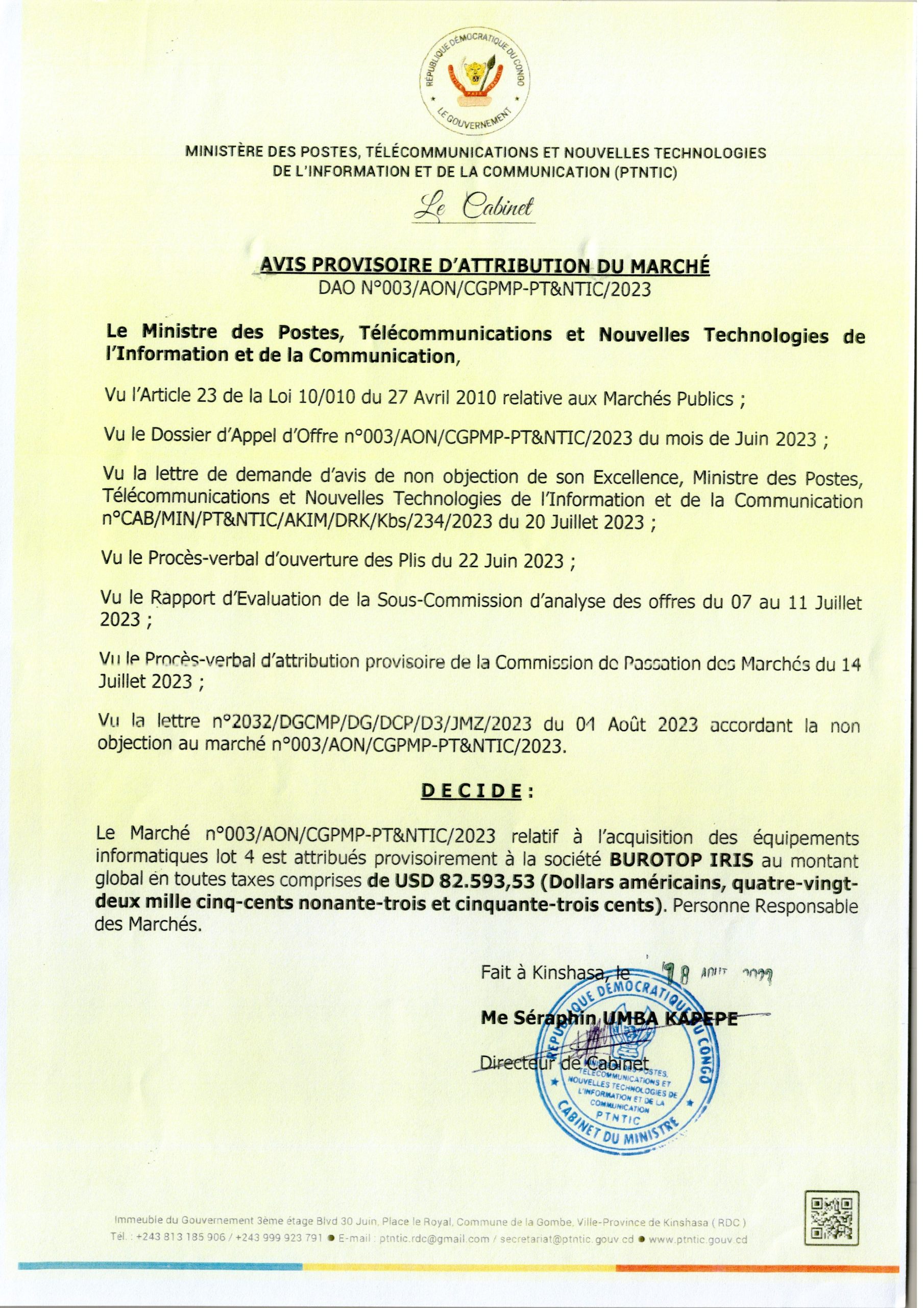 AVIS D’ATTRIBUTION PROVISOIRE DU MARCHÉ ACCORDÉE À LA SOCIÉTÉ BUROTOP IRIS RELATIVE À L’ACQUISITION DES ÉQUIPEMENTS INFORMATIQUES LOT 4.
