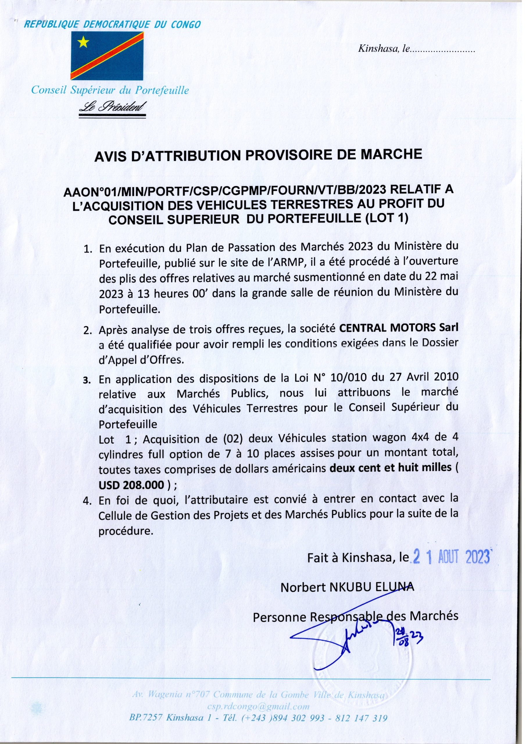 Attribution provisoire accordée à la société CENTRAL MOTORS relative à l’acquisition des véhicules terrestres au profit du Conseil Supérieur du Portefeuille ( LOT 1)