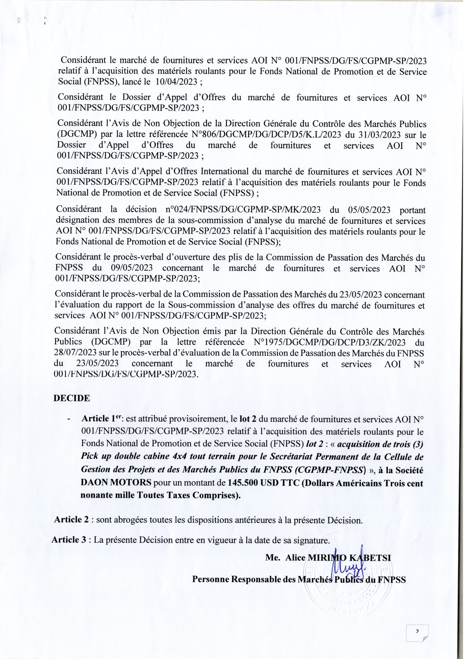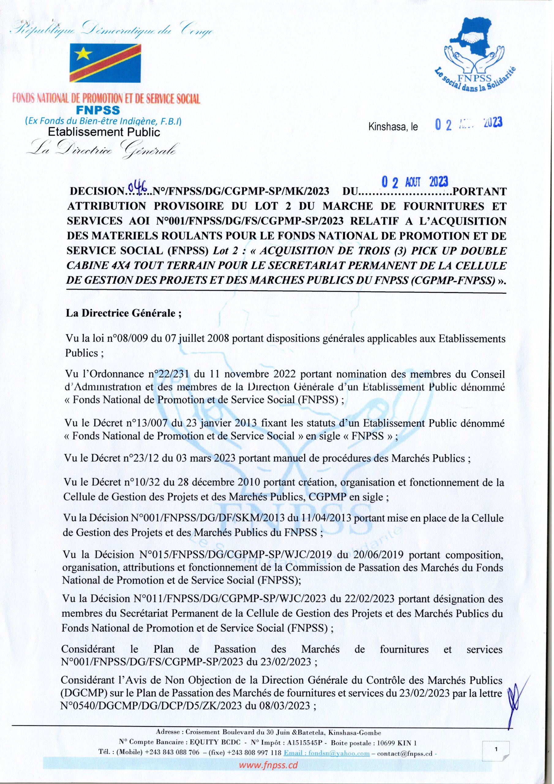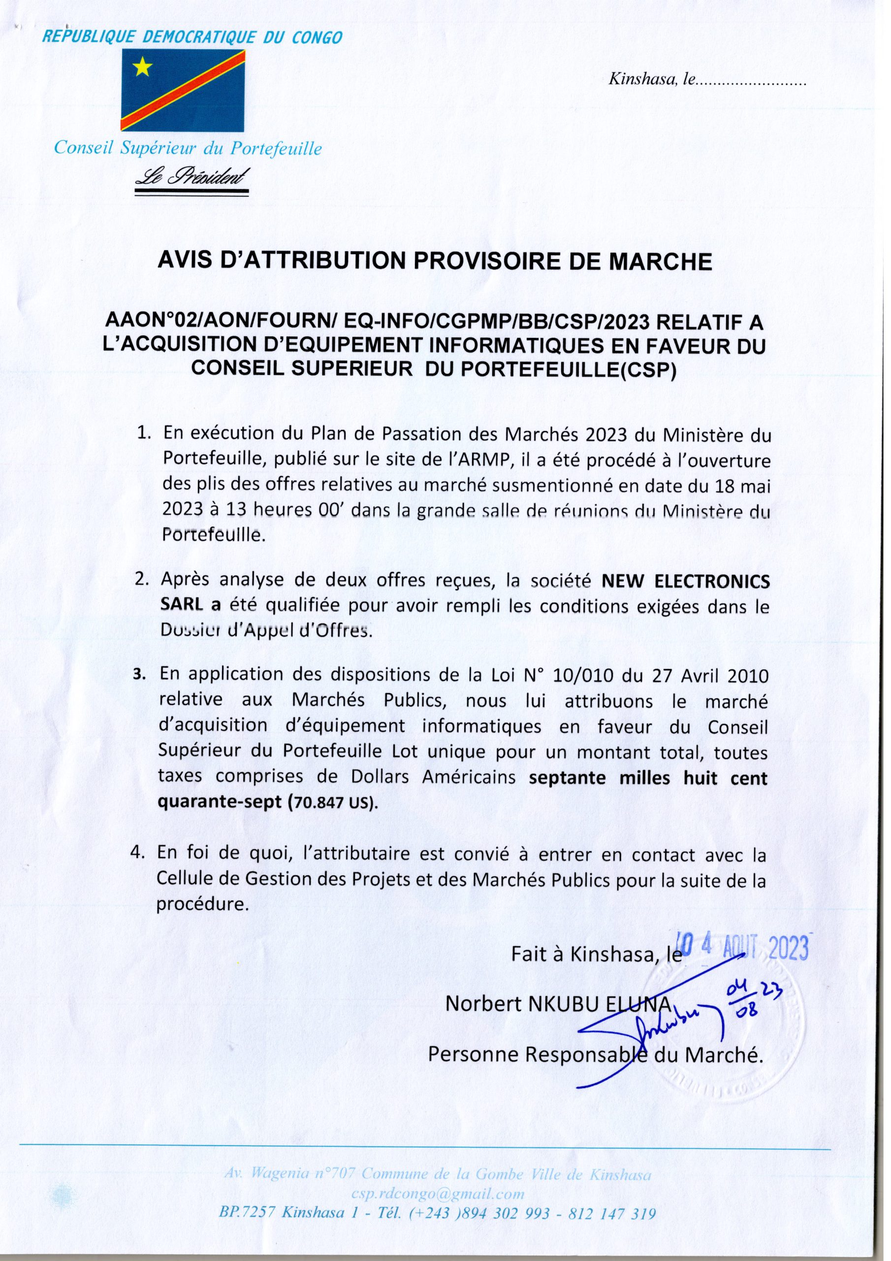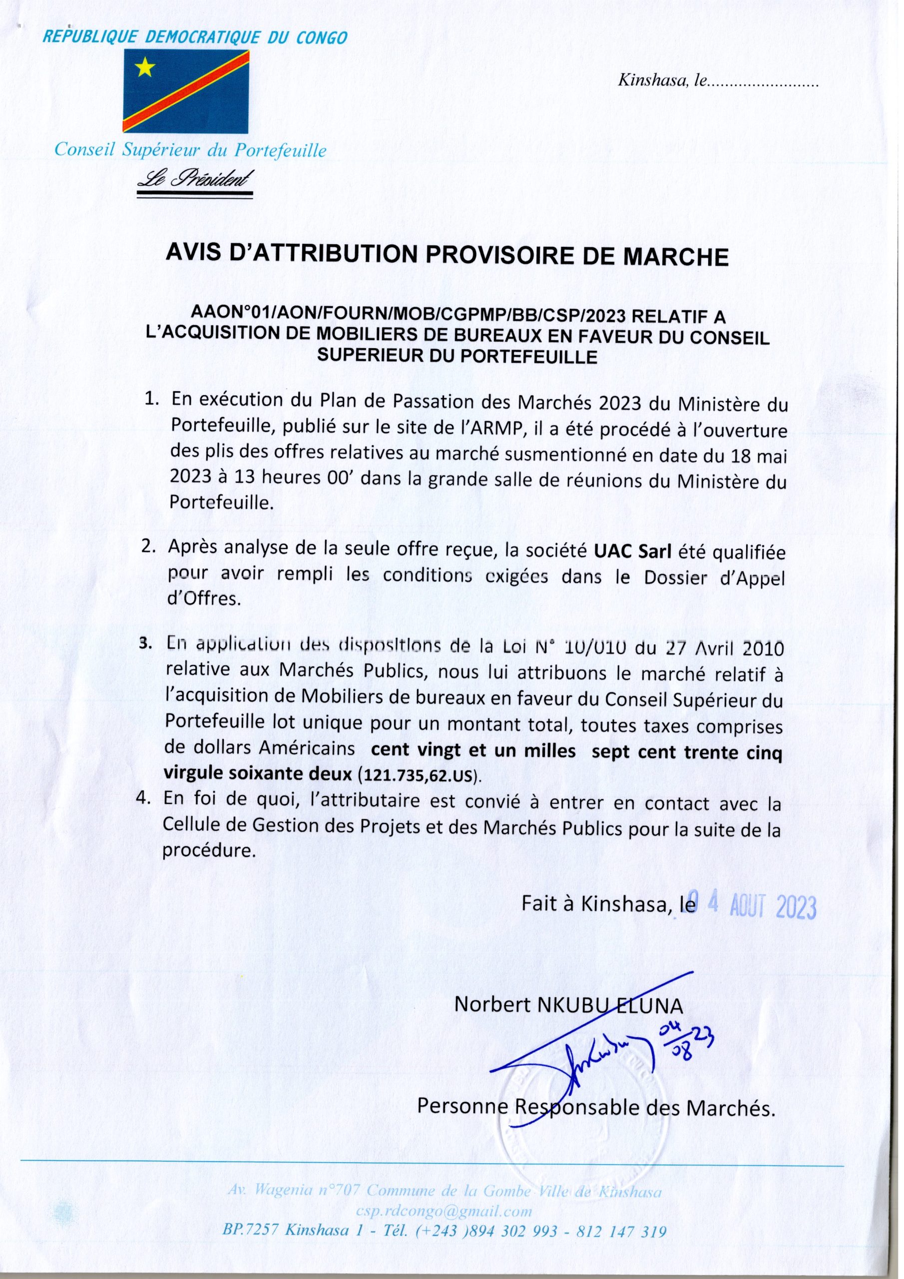 Attribution Provisoire du marché des prestations intellectuelles relatif au Services de consultant devant assurer la mission des études de recadrage du Bloc opératoire, de la fusion des bloc 13 et 14 et des travaux du parking extérieur de la morgue, du mur de séparation ; … au bureau d’Etudes KONGO CONSULT